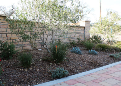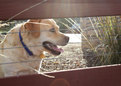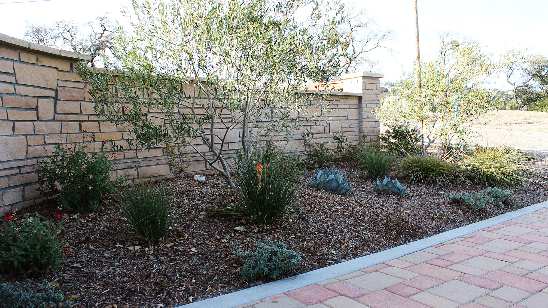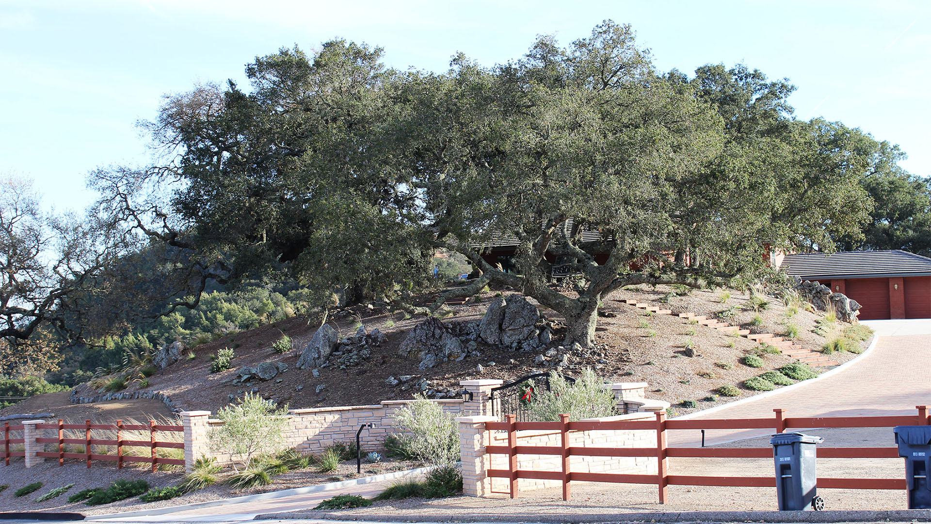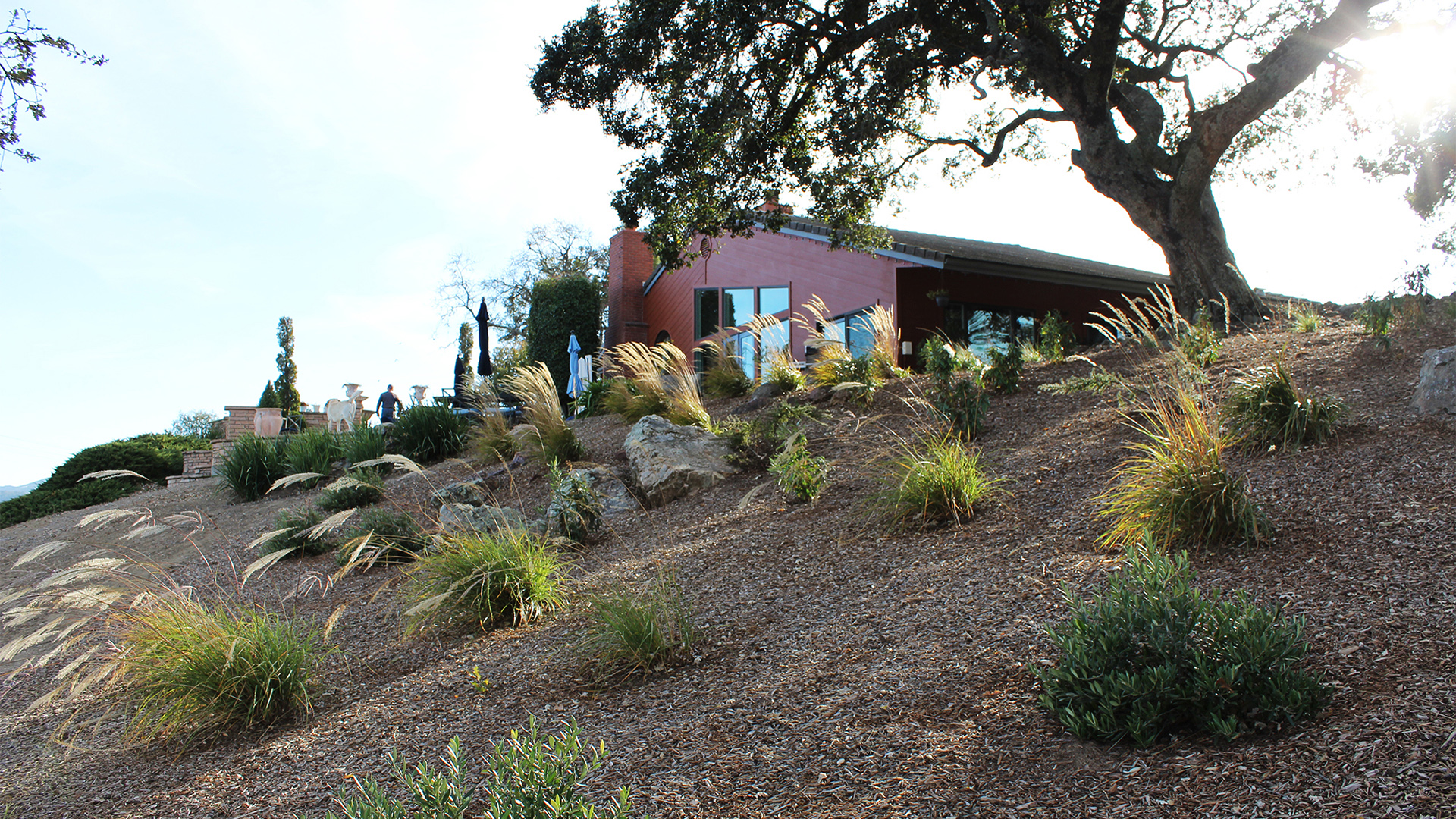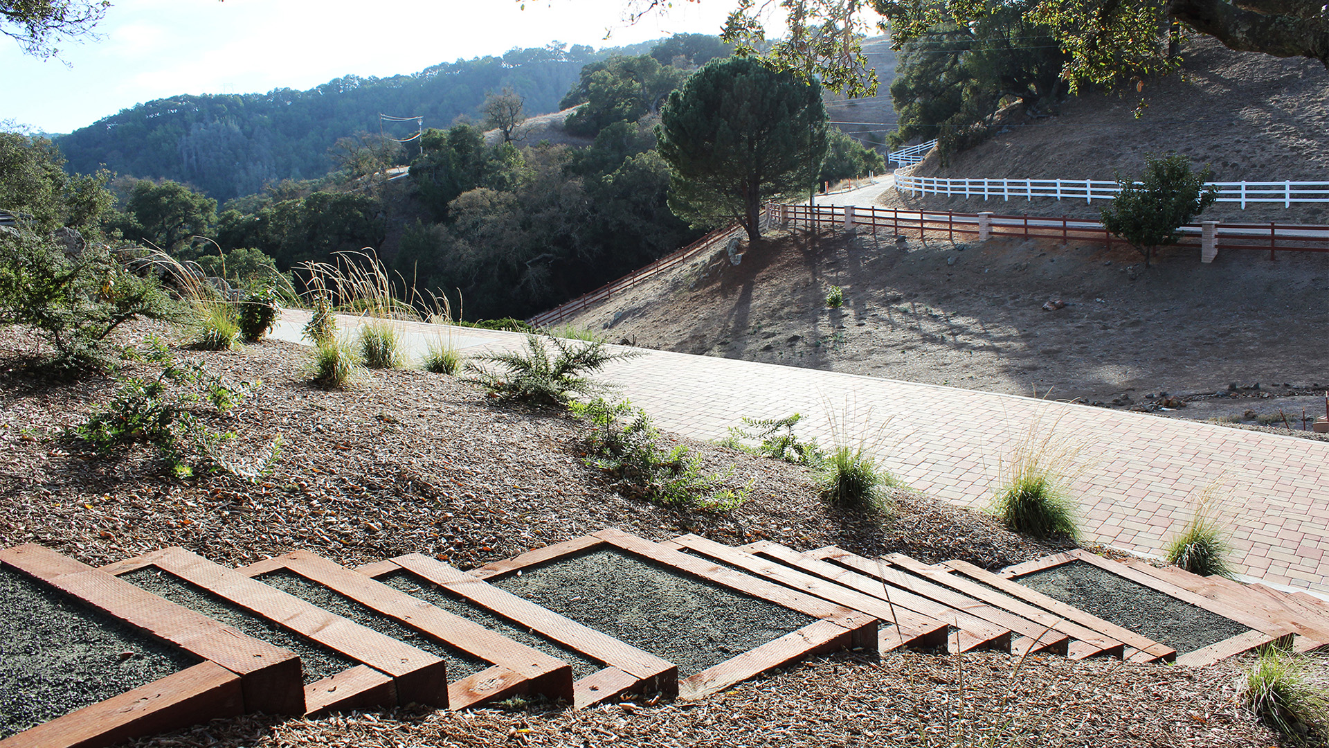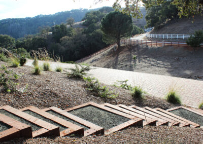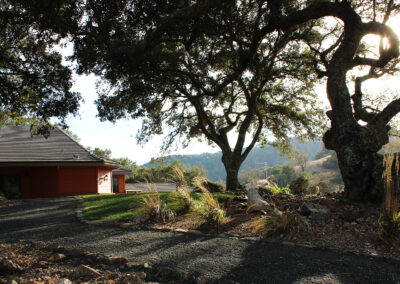 The landscape includes a redwood staircase with dg treads built into the hill, allowing full access to the best views on the property. The planting design plays off of the oaks, using a variety of textures and natives, while low-spreading plants provide erosion control and aesthetically pleasing views from below.