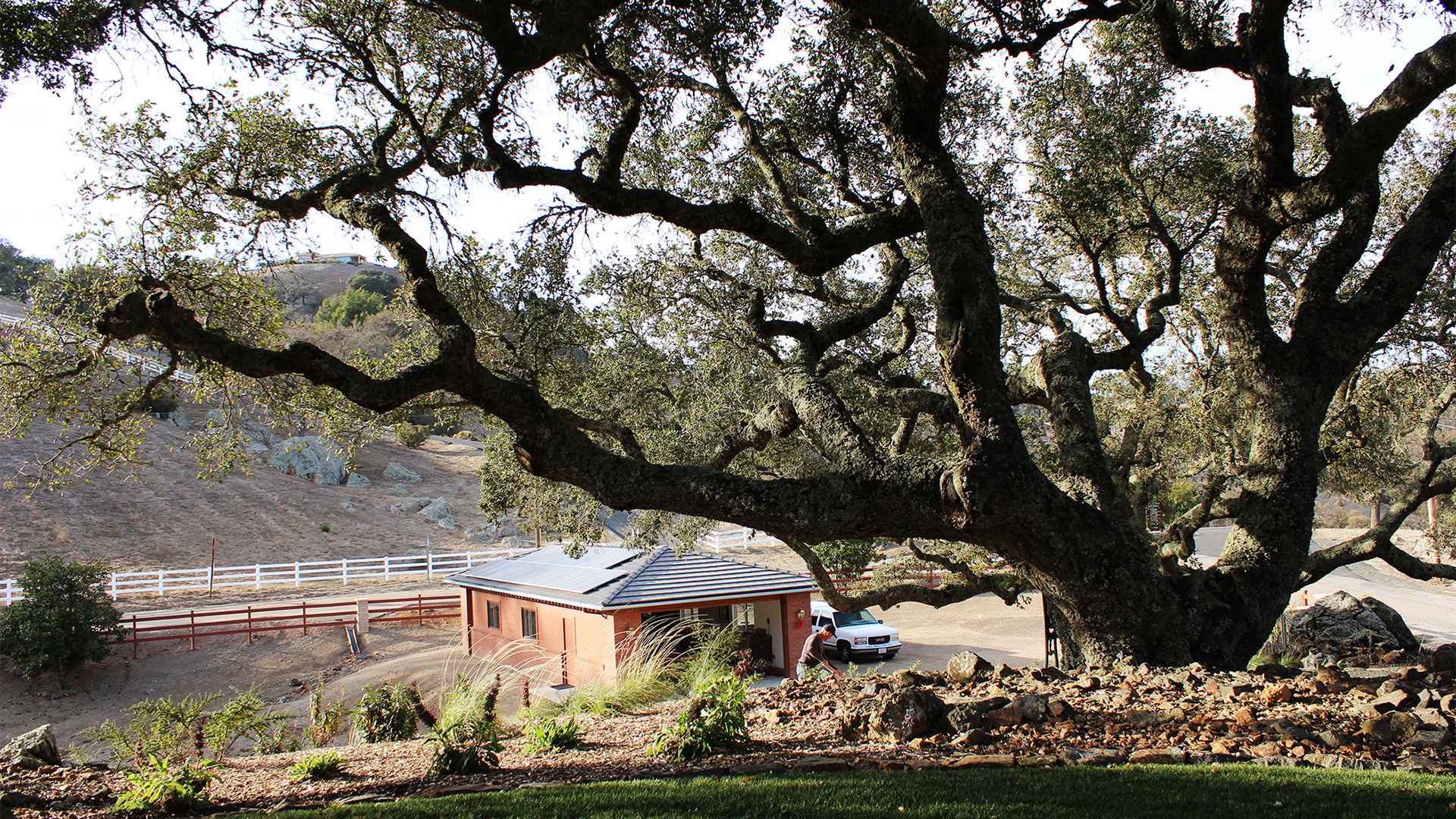 In the hills of Atascadero, this residence rests on a peak amid the shade of large, stately oak trees.