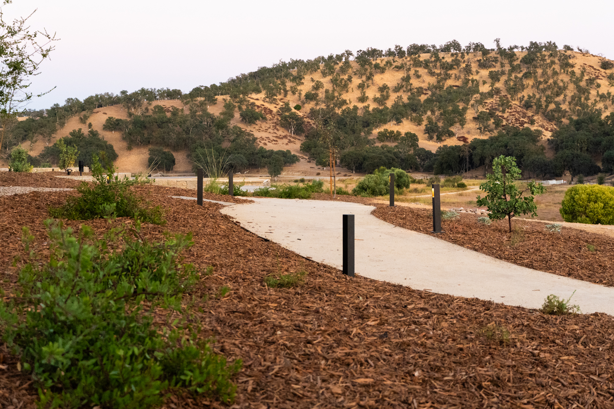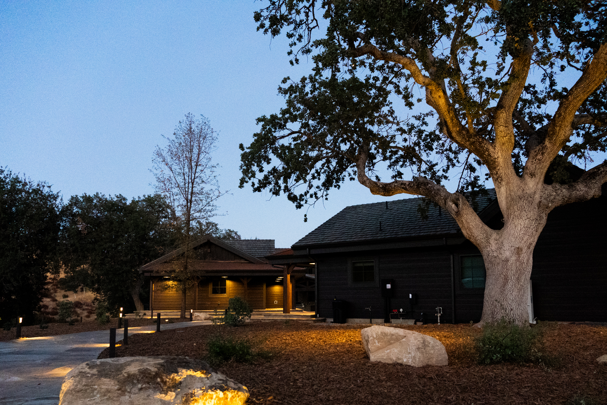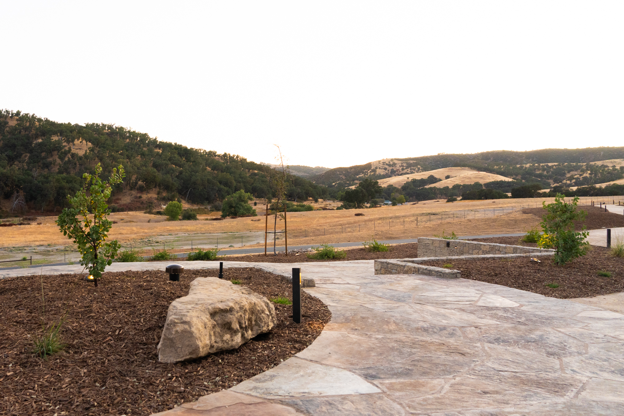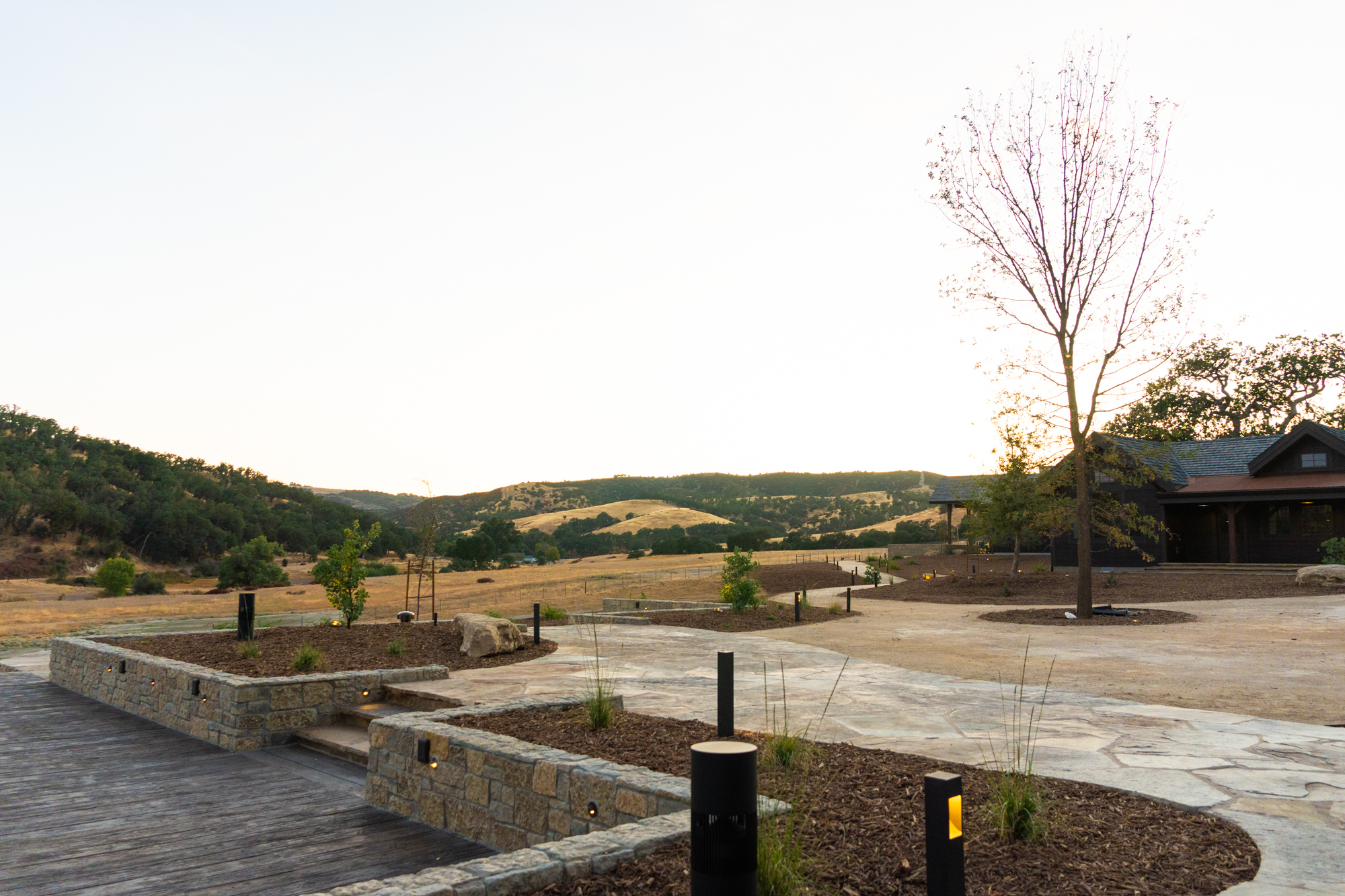 Perched on the edge of an existing oak woodland and overlooking a seasonal creek, the all-new outdoor and indoor living spaces seamlessly blend into the rugged natural setting. A flagstone pathway system links five structures with both a sport court and pool, and a scattering of large oak trees accent the site. Large boulders dot entry points and key features, while a limited palette of native plantings add texture and life. A full lighting installation brings warmth and safety in the evening, while remaining simple and unassuming midday.