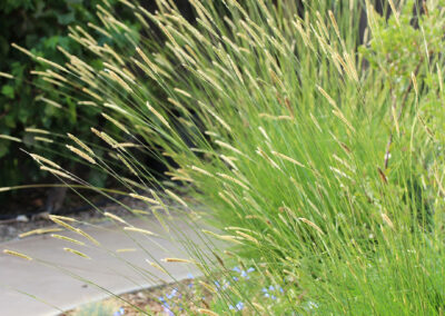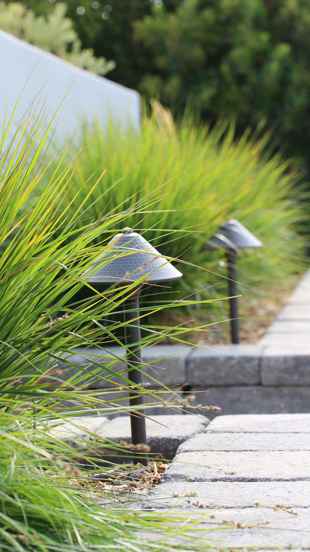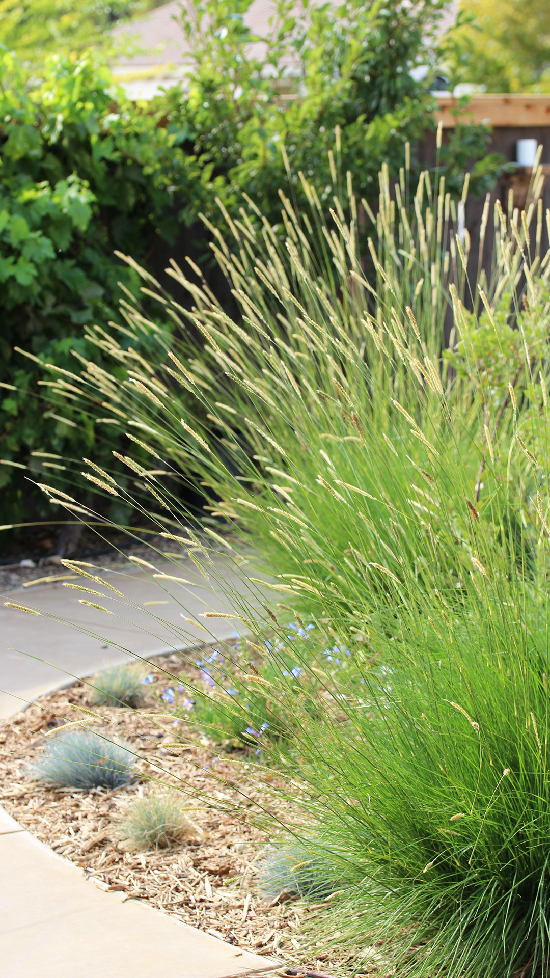 Past a south facing raised vegetable bed and fruit trees, a wide path winds through tall deer grass on its way to the backyard, pool, and patio. A curving, elevated bed of stacking stone along one side of the pool decking is wide enough to sit on, full of native plants and another vanishing fountain.