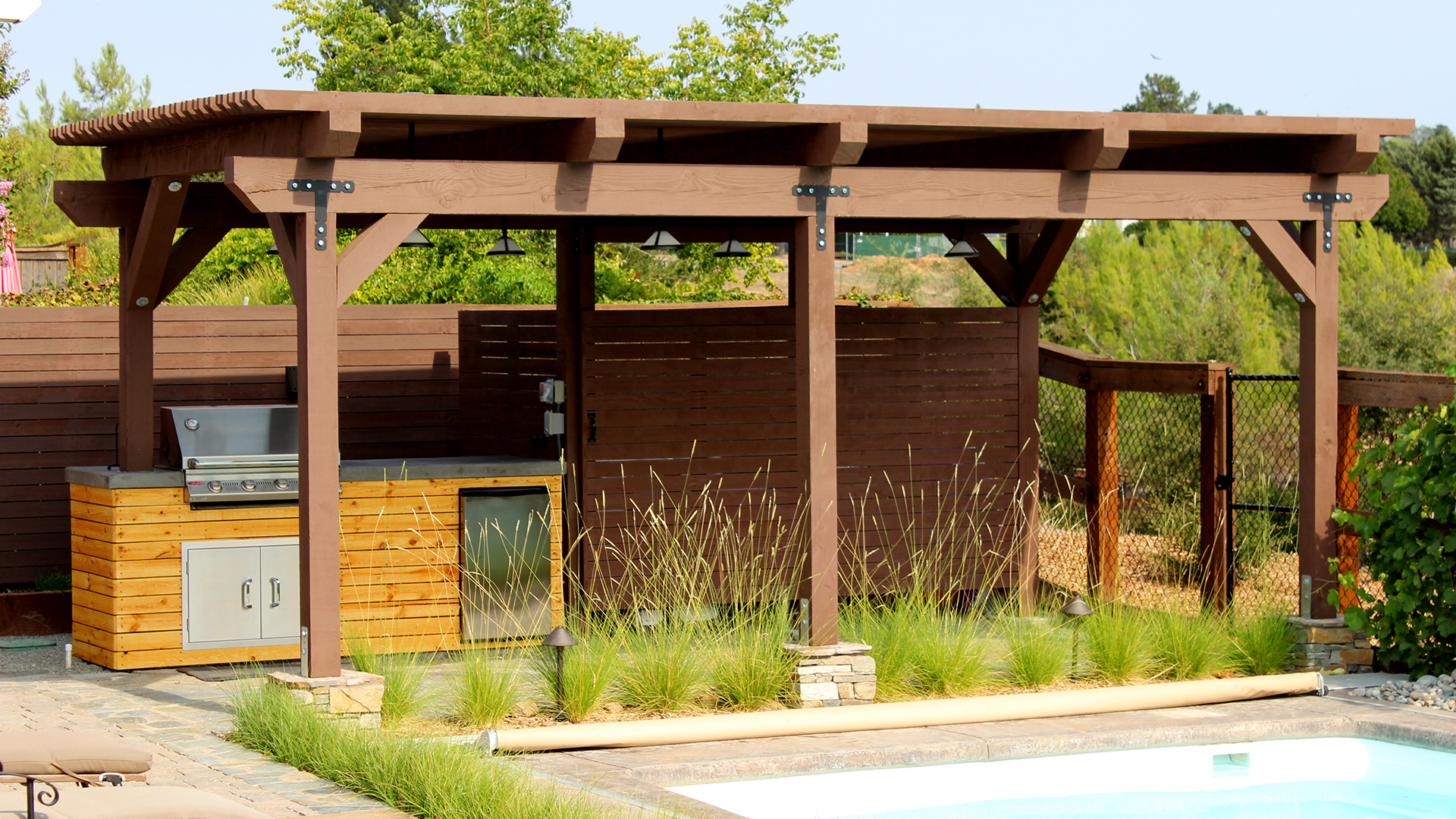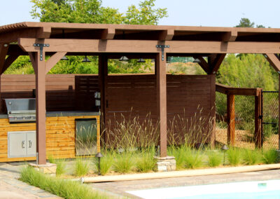 An outdoor poolside kitchen provides a focal point for the backyard. Rough-sawn, horizontal siding covers the existing fence and continues along the back of the structure as a sliding barn door to conceal pool equipment. Slender veldt grass, Carpenteria Bush Anemone, carex, and potted succulents hug the various stone surface treatments. The cypress bar is recycled from the same log as the front benches.