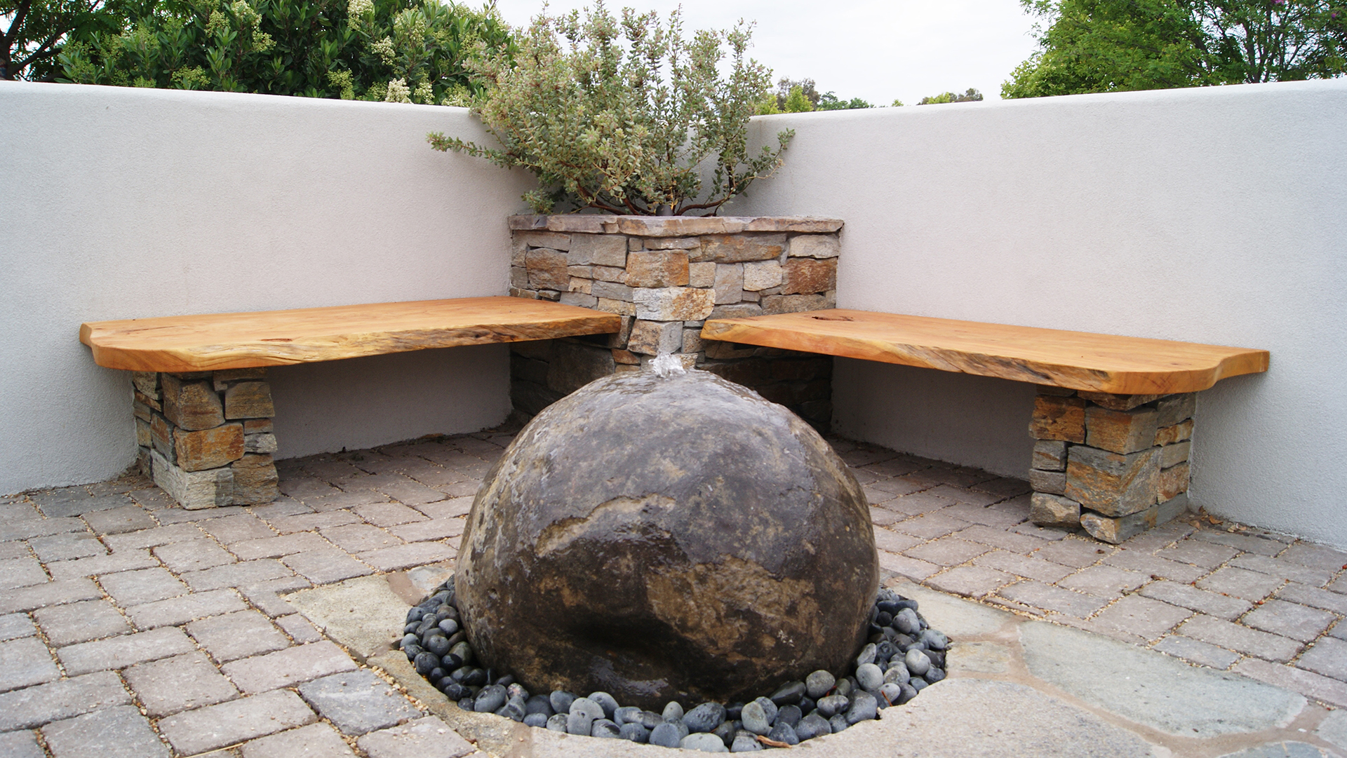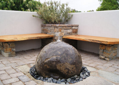 A mortarless retaining wall, wide sidewalk of permeable pavers, and low stucco wall shield an inviting yet private front patio from the street. A local boulder with a core-drilled center serves as a vanishing fountain flanked by two benches made from recycled cypress logs. Two of the seven varieties of manzanita on the property grace the porch: the Manzanita morroensis, native to Morro Bay, and the Dr. Hurd, a multi-branched tree with glossy light green leaves.