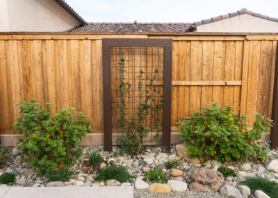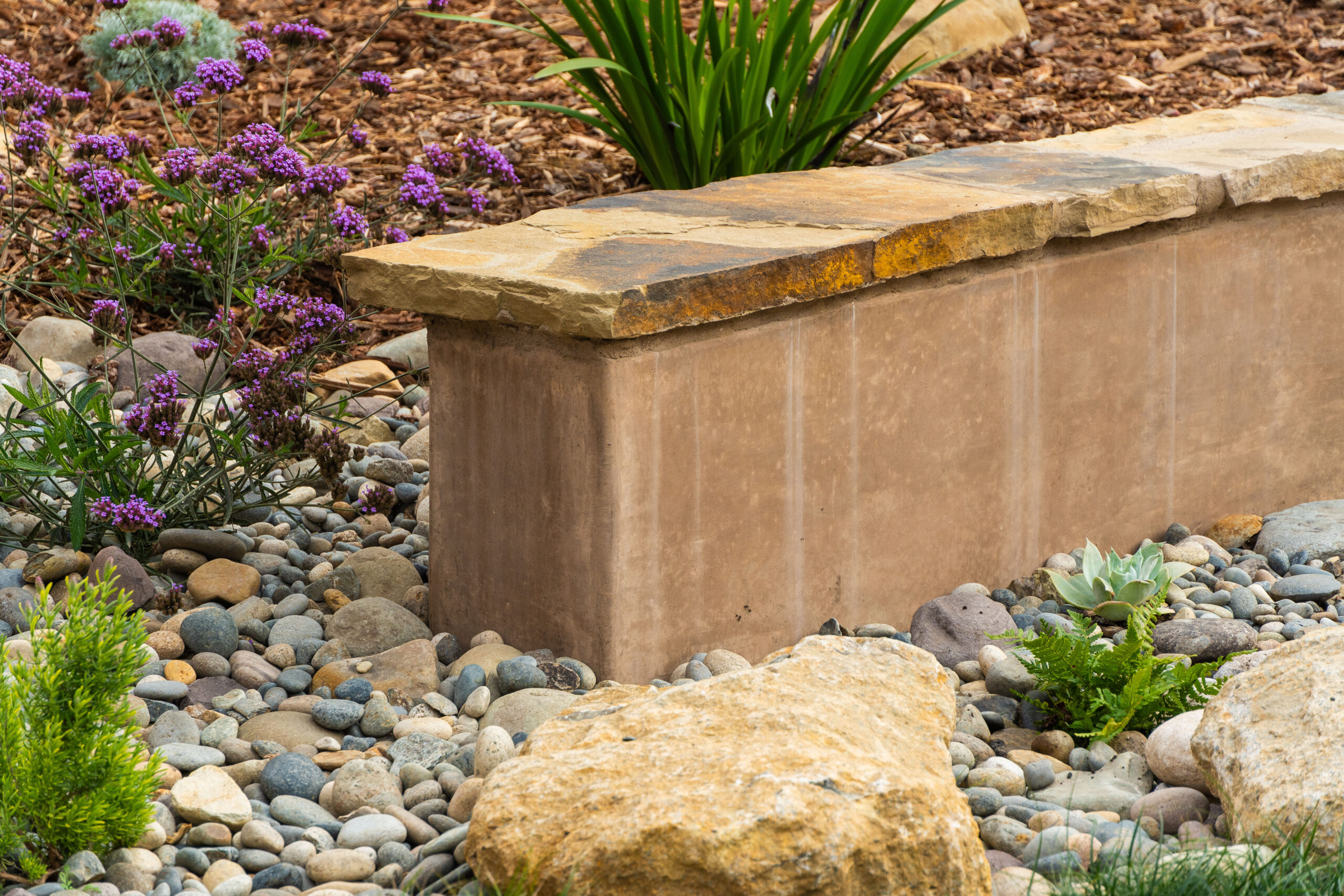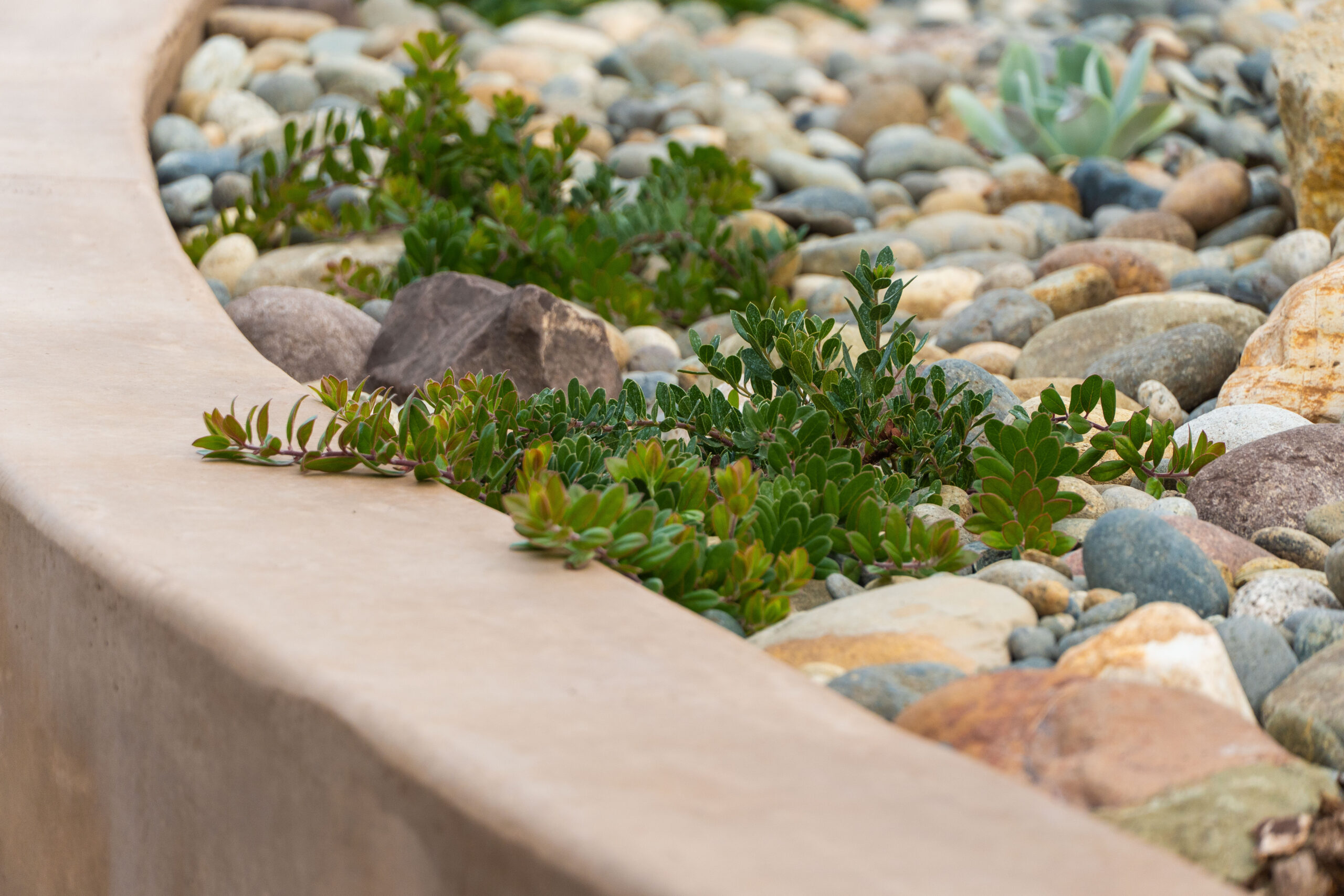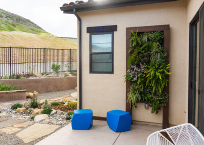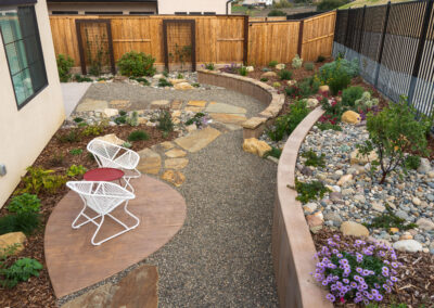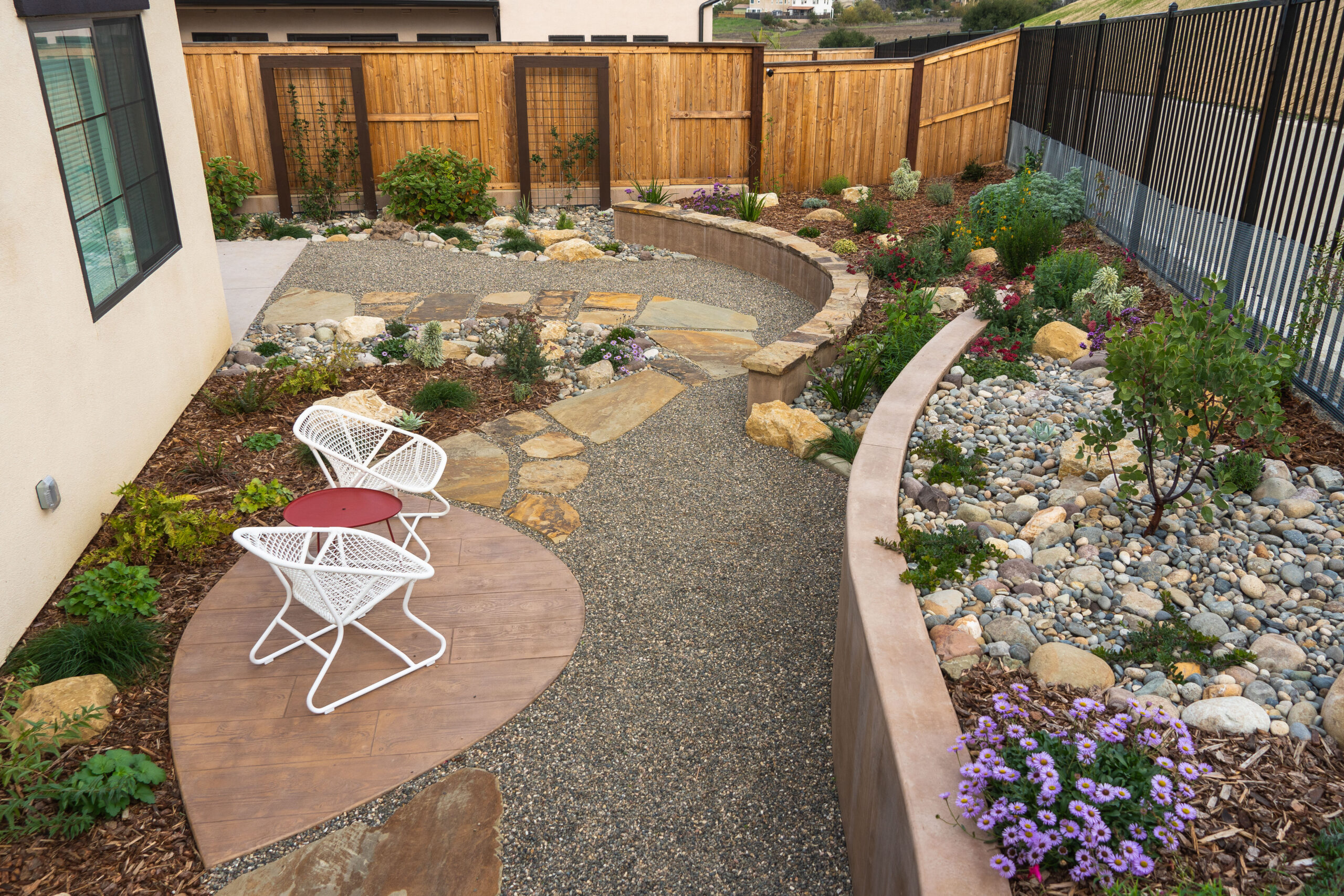 Nestled against one of San Luis Obispo’s hillside open spaces, this new residence now offers a serene, naturalistic, and vibrant back landscape for its new owners. Two curving concrete walls establish a level lower area while carving out two distinct upper levels of planting, offering a variety of spaces for an array of native plantings. A new concrete patio with a rustic wood plank texture is connected by a sinuous pathway of Sweetwater flagstone, surrounded by a clean field of pea gravel. A swath of cobble swoops through the site from one corner to the other, interspersed with boulders and dotted with low plantings. Multiple custom trellis structures offer additional interest and support for sweetly flowering honeysuckle, mirrored across the patio by a custom green wall structure that is automatically irrigated and fertilized, tied in with the sitewide system.