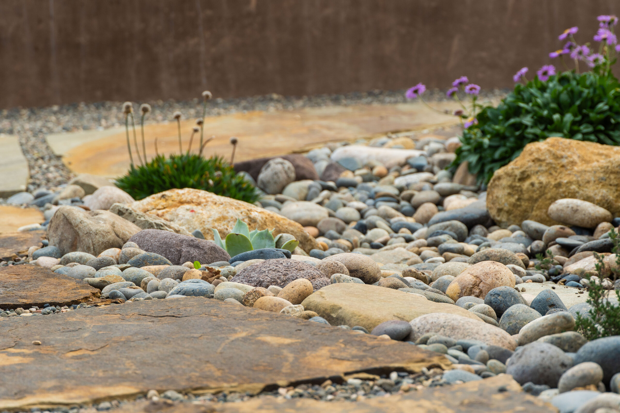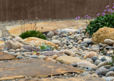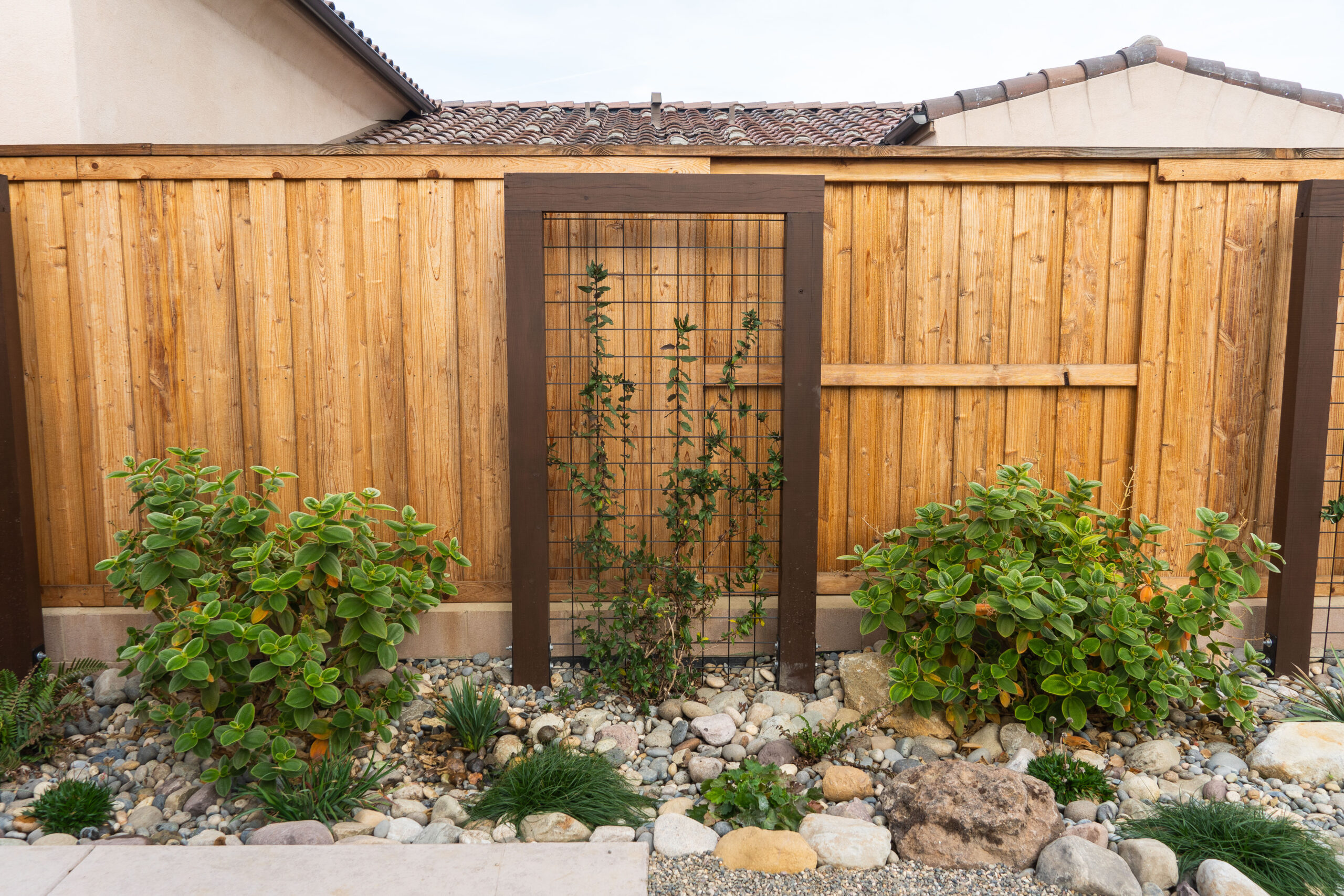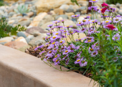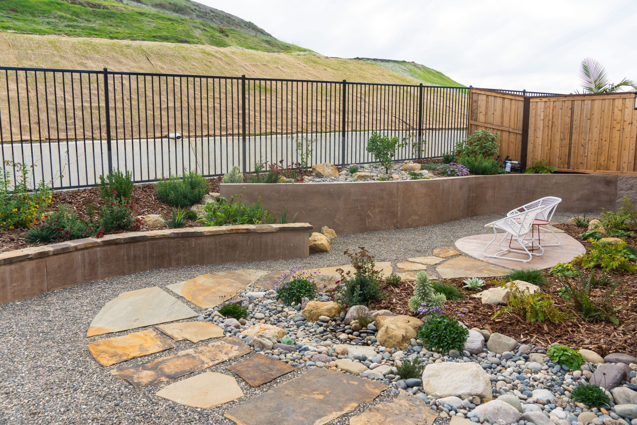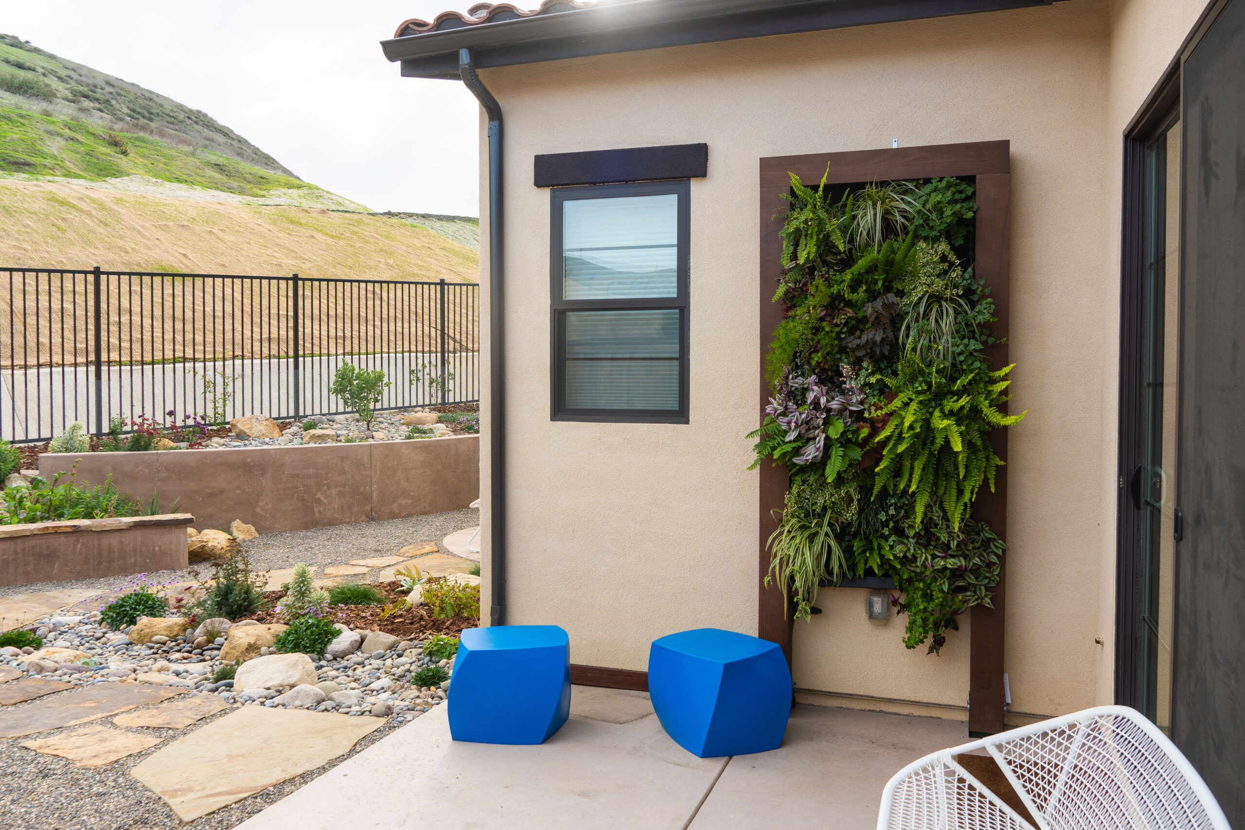 Nestled against one of San Luis Obispo’s hillside open spaces, this new residence now offers a serene, naturalistic, and vibrant back landscape for its new owners. Two curving concrete walls establish a level lower area while carving out two distinct upper levels of planting, offering a variety of spaces for an array of native plantings. A new concrete patio with a rustic wood plank texture is connected by a sinuous pathway of Sweetwater flagstone, surrounded by a clean field of pea gravel. A swath of cobble swoops through the site from one corner to the other, interspersed with boulders and dotted with low plantings. Multiple custom trellis structures offer additional interest and support for sweetly flowering honeysuckle, mirrored across the patio by a custom green wall structure that is automatically irrigated and fertilized, tied in with the sitewide system.