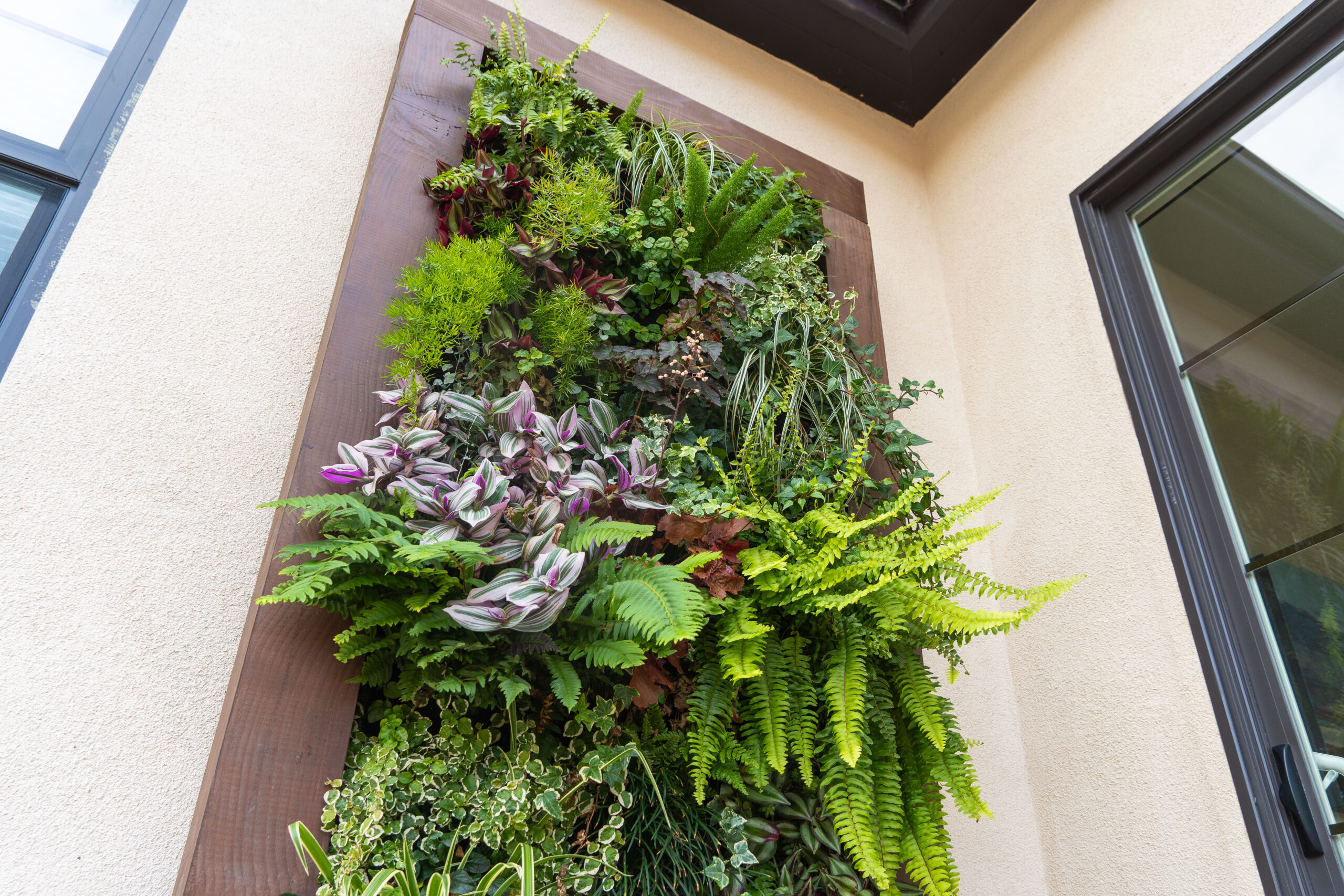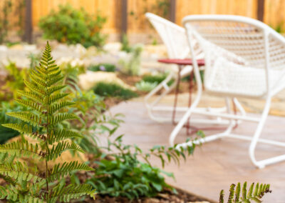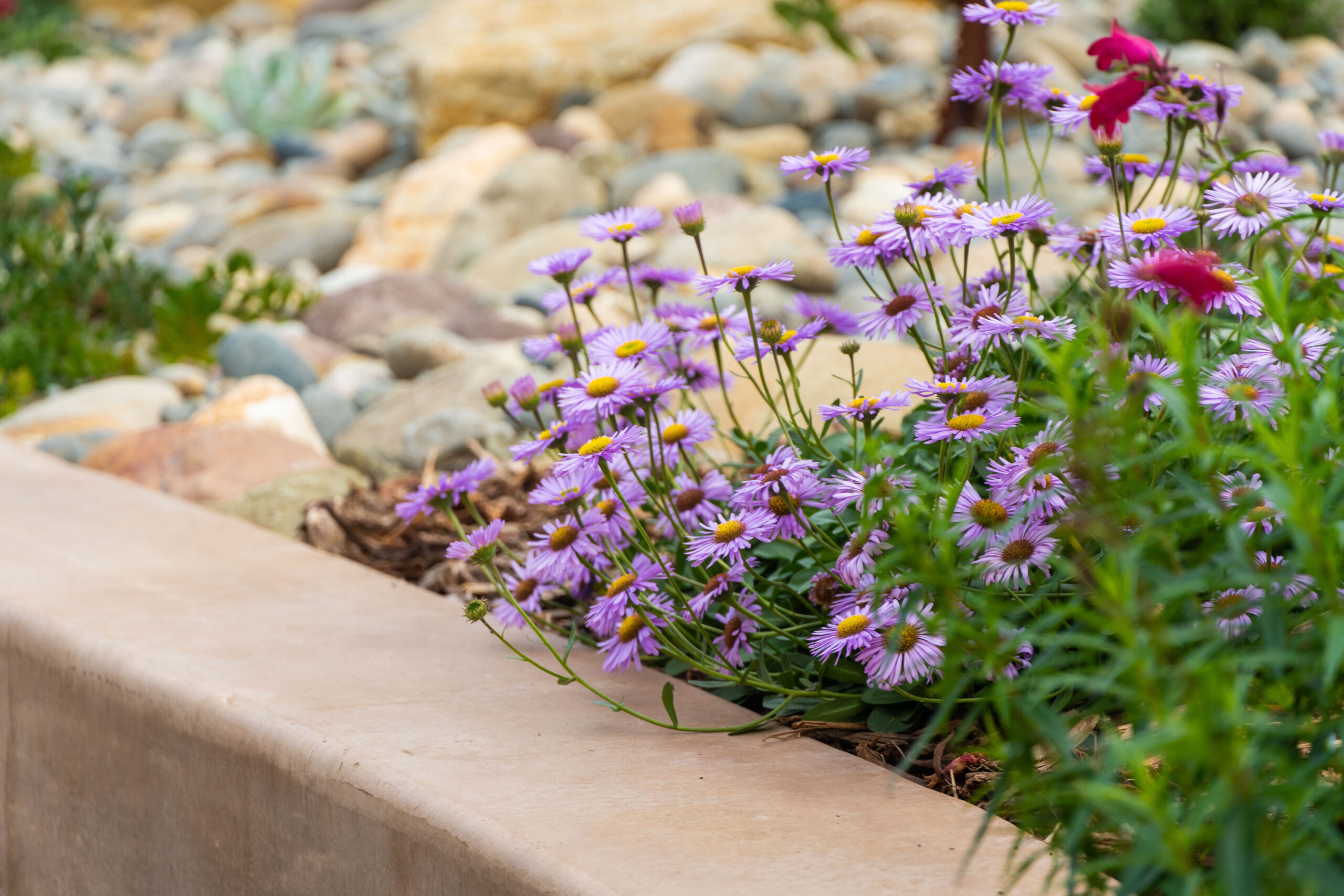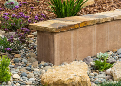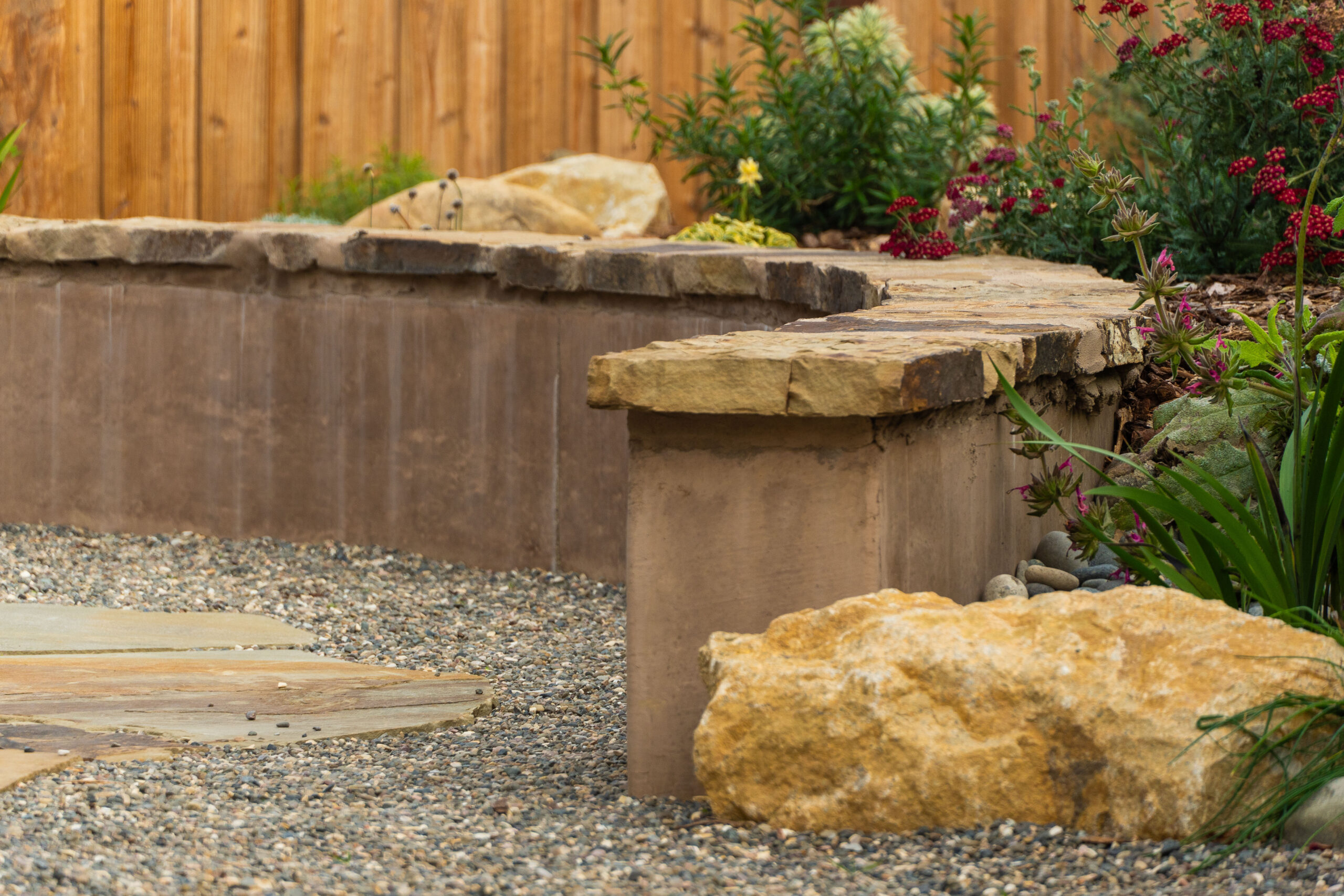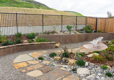 Nestled against one of San Luis Obispo’s hillside open spaces, this new residence now offers a serene, naturalistic, and vibrant back landscape for its new owners. Two curving concrete walls establish a level lower area while carving out two distinct upper levels of planting, offering a variety of spaces for an array of native plantings. A new concrete patio with a rustic wood plank texture is connected by a sinuous pathway of Sweetwater flagstone, surrounded by a clean field of pea gravel. A swath of cobble swoops through the site from one corner to the other, interspersed with boulders and dotted with low plantings. Multiple custom trellis structures offer additional interest and support for sweetly flowering honeysuckle, mirrored across the patio by a custom green wall structure that is automatically irrigated and fertilized, tied in with the sitewide system.