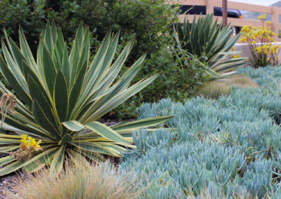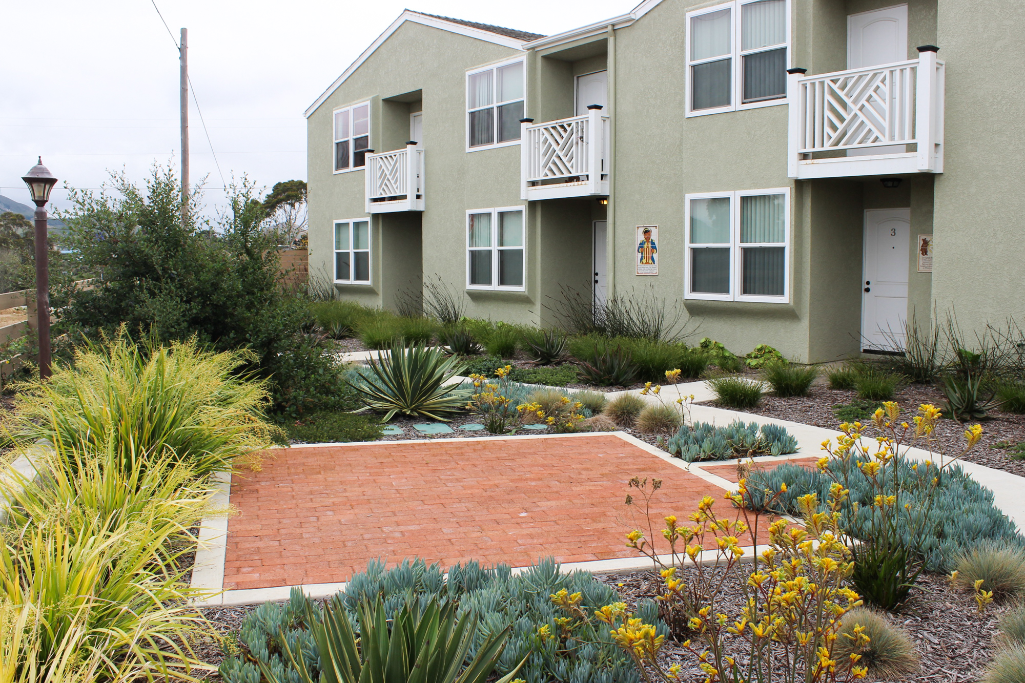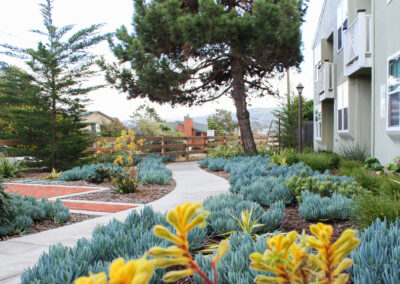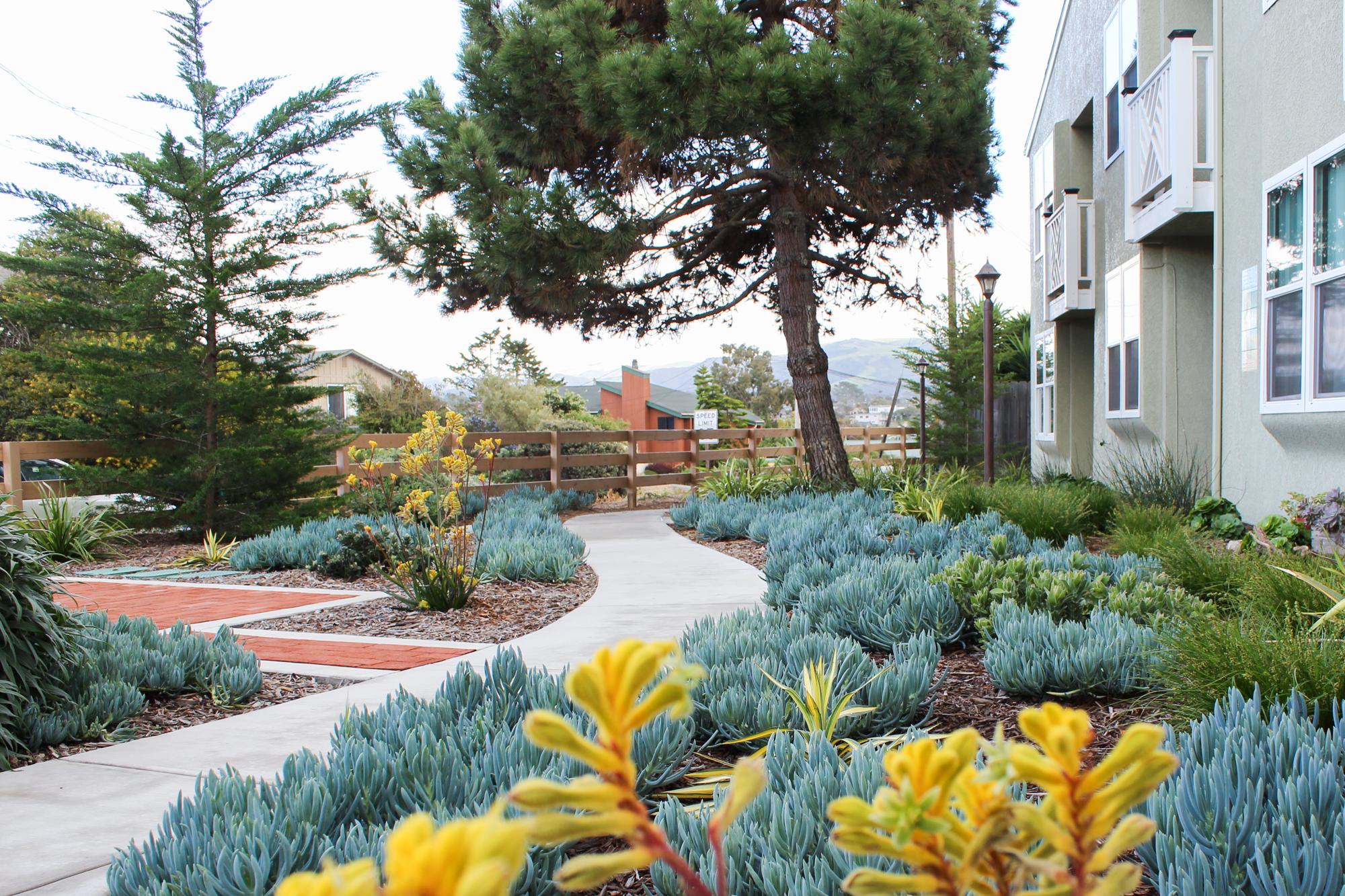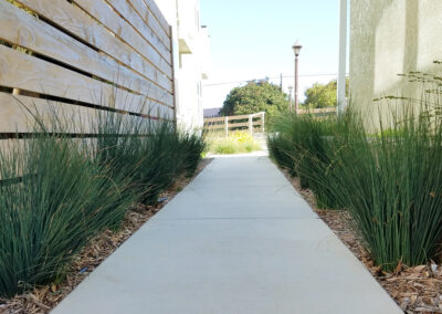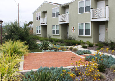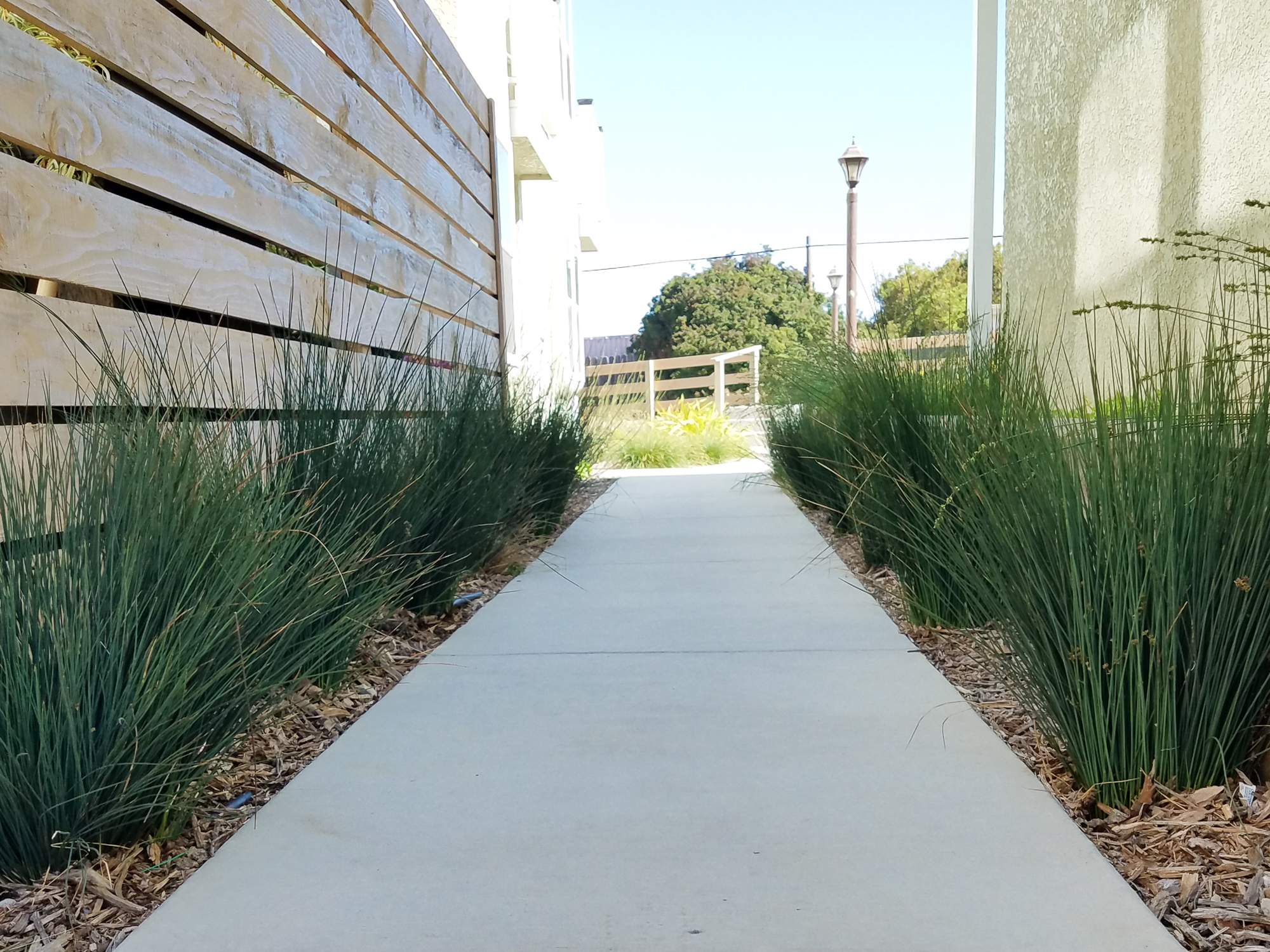 Low-maintenance, drought-tolerant succulents and natives bloom year-round. Pathways lead through the residential complex, easily guiding residents to parking, laundry, and outdoor areas.