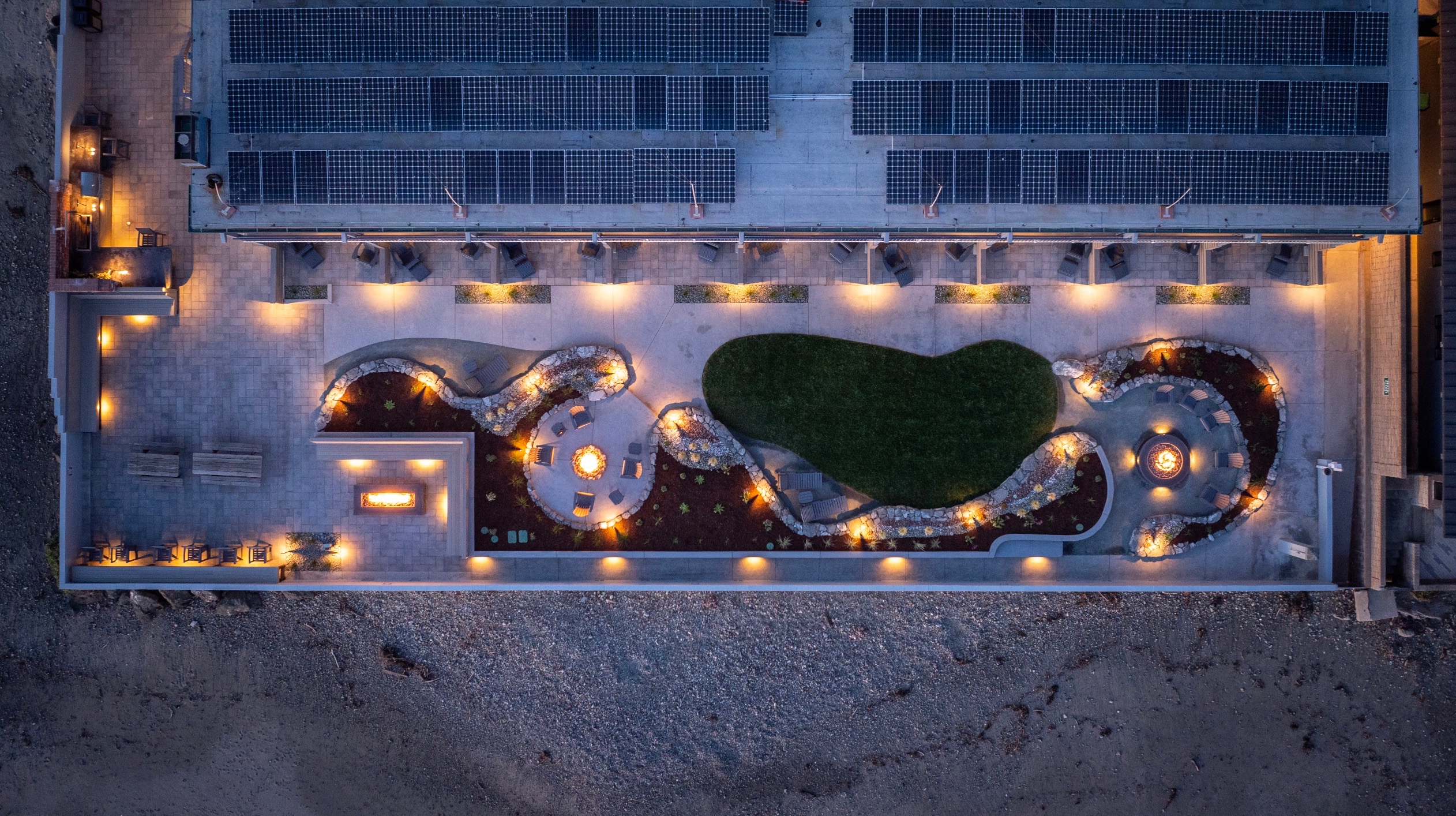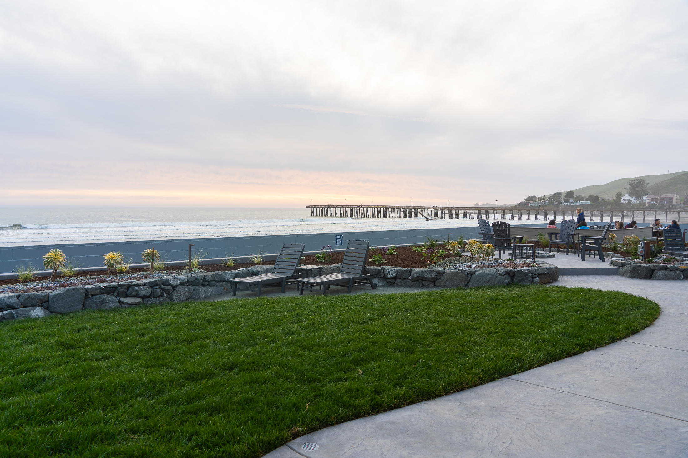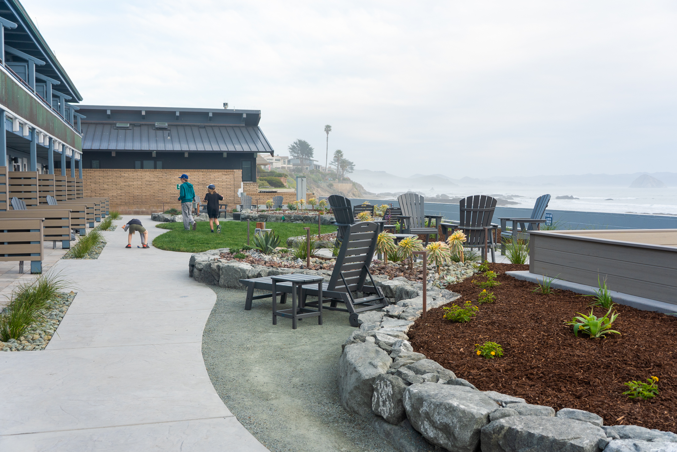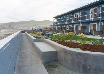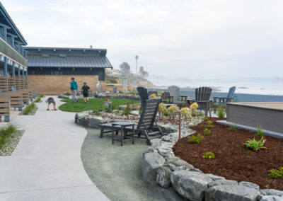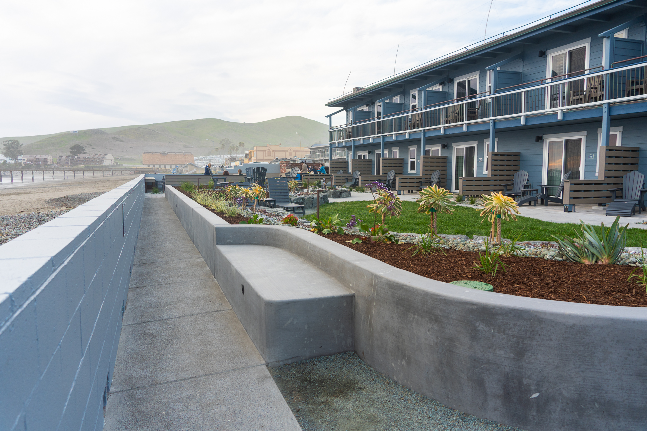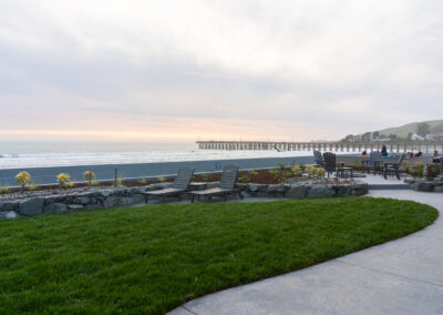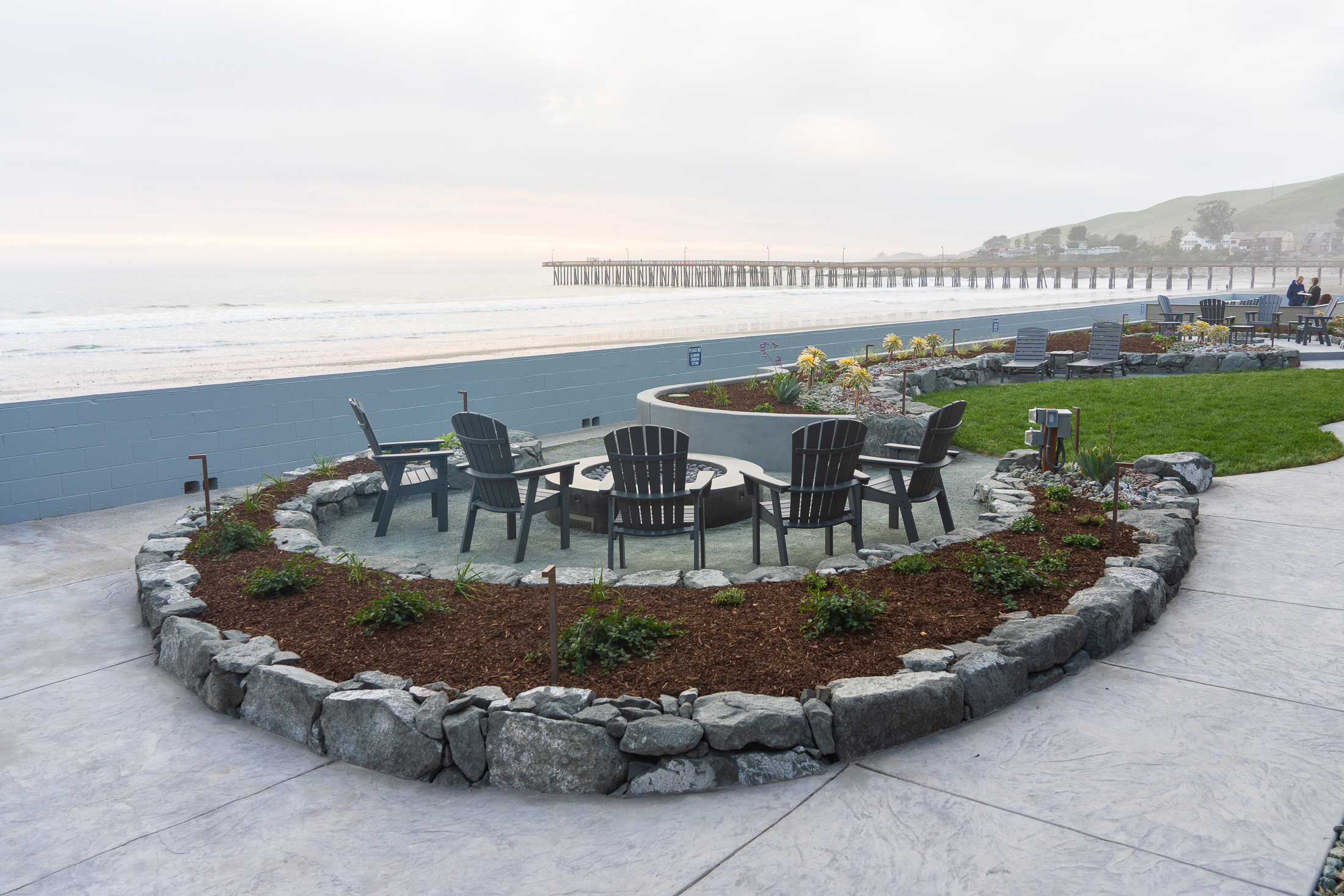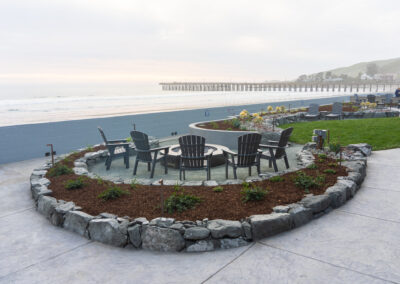 Welcome to beachfront bliss here on the Central Coast! Here’s a project for visitors to the Inn to enjoy both during the day with scenic views of Morro Rock or after dark around one of three custom-designed fire pits. The main statement wall made of locally-sourced Cambria stone is curved to mimic the organic shapes of shore and waves. Madrone detailed everything from the partition walls, barbeque island, fire pits and seat walls to the beach pebbles and planted areas. Materials such as composite wood, colored beach pebbles and pavers were selected for their durability as well as beauty. Ample landscape lighting further makes the space inviting as the sun sets on a truly gorgeous location.