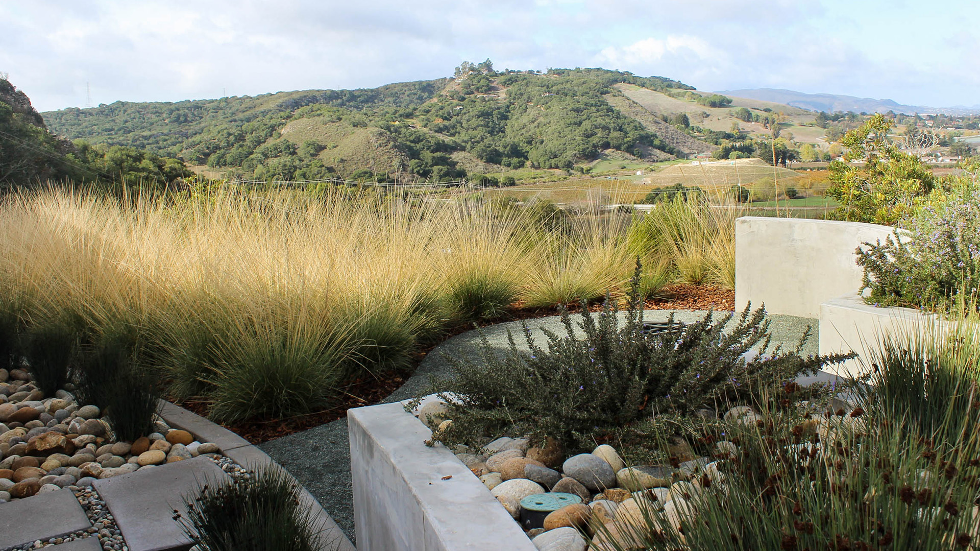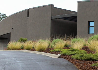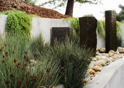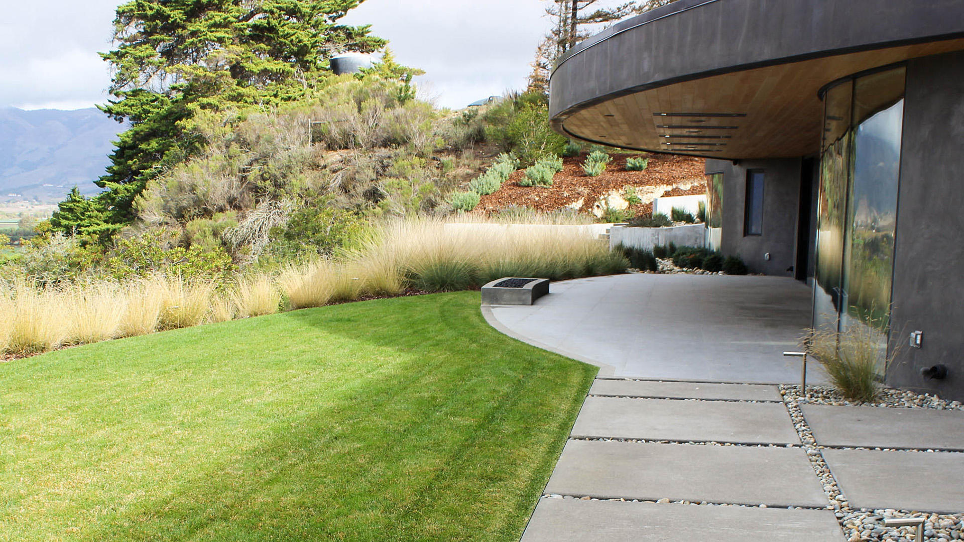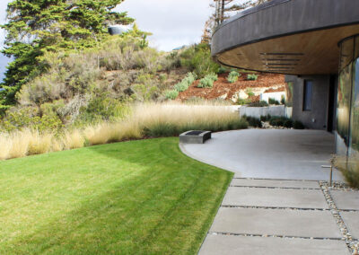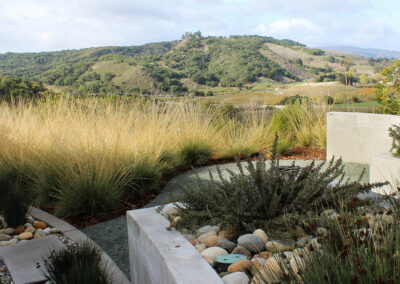 This modern residence nestled in the cleft of a ridgeline in San Luis Obispo boasts a restrained yet refined landscape design to maximize appreciation and functionality from the unique setting. A large, curved lawn echoes the strong curves of the custom residence, transitioning softly through waving grasses to the native shrubs behind. Various moments around the house are accentuated through elegant used of rock and cobble combined with a a thoughtful planting palette. Various native species including Muhlenbergia, Juncus, Arctostaphylos (Manzanita), and Clinopodium lend an extra sense of belonging, with key species framing views, softening lines, and defining pathways around the site.
