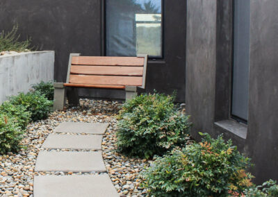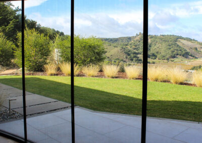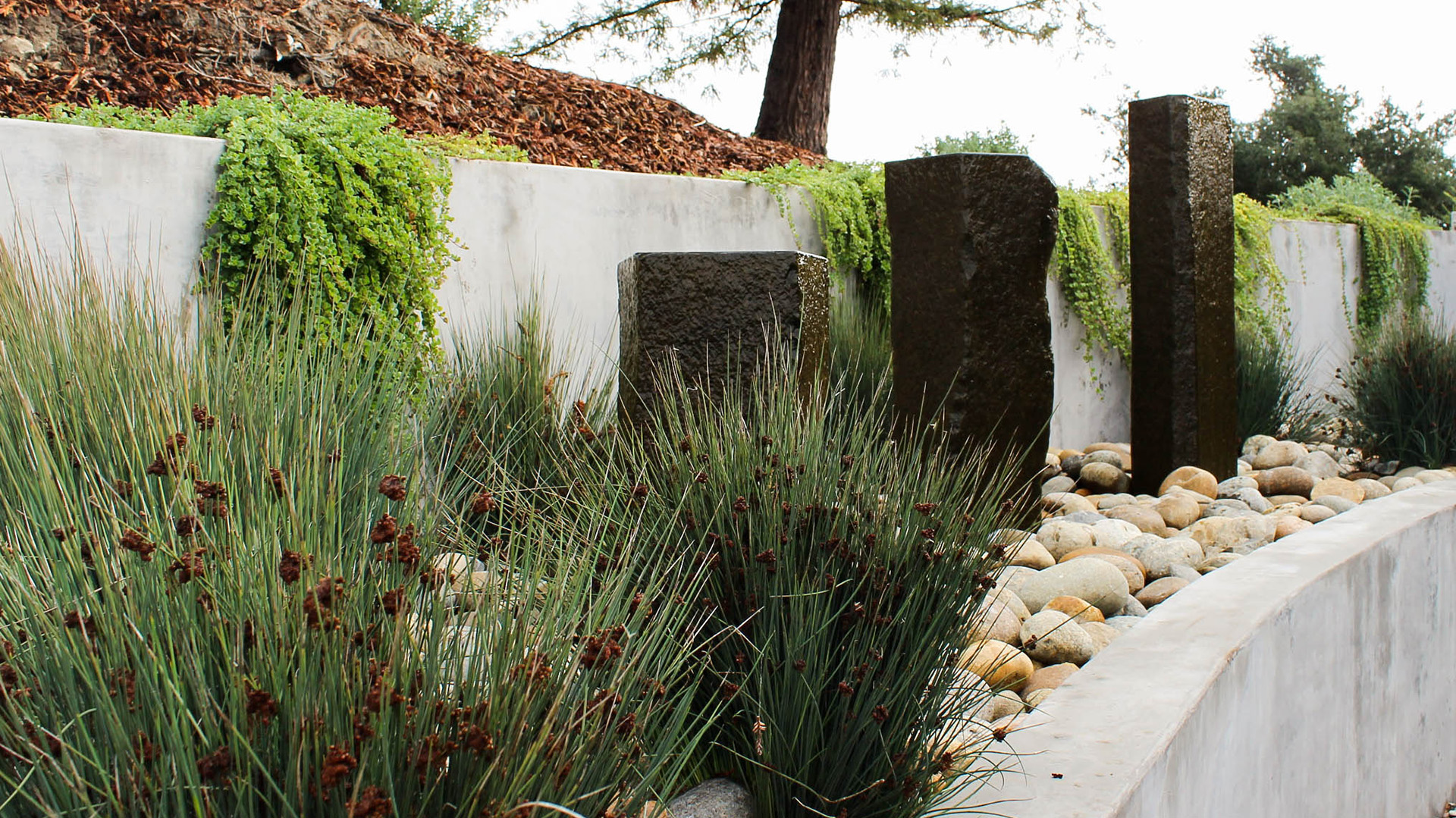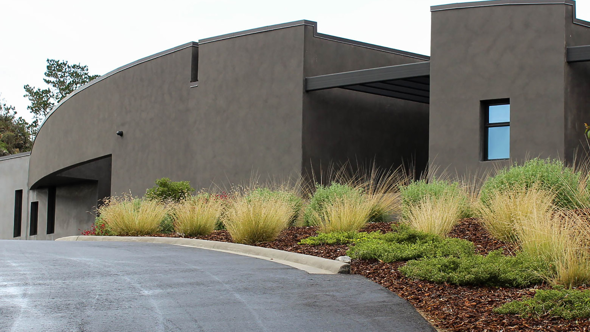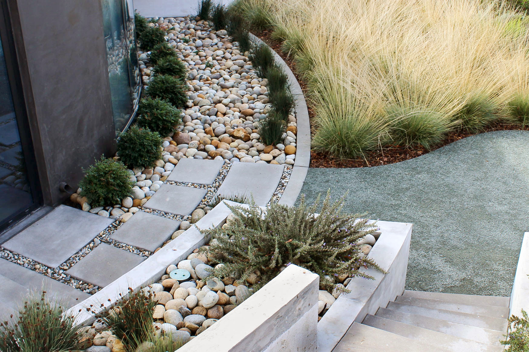 This modern residence nestled in the cleft of a ridgeline in San Luis Obispo boasts a restrained yet refined landscape design to maximize appreciation and functionality from the unique setting. A large, curved lawn echoes the strong curves of the custom residence, transitioning softly through waving grasses to the native shrubs behind. Various moments around the house are accentuated through elegant used of rock and cobble combined with a a thoughtful planting palette. Various native species including Muhlenbergia, Juncus, Arctostaphylos (Manzanita), and Clinopodium lend an extra sense of belonging, with key species framing views, softening lines, and defining pathways around the site.