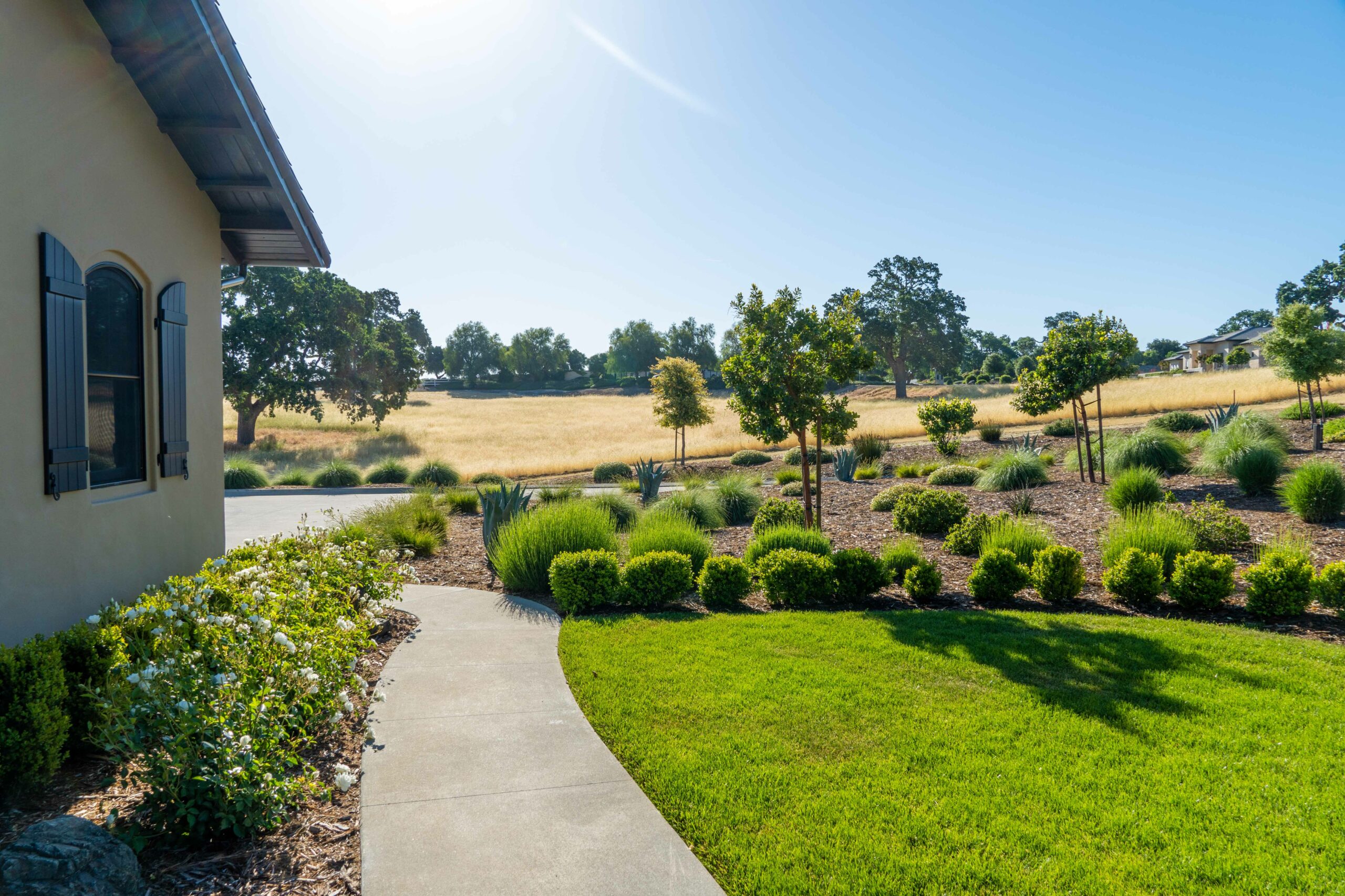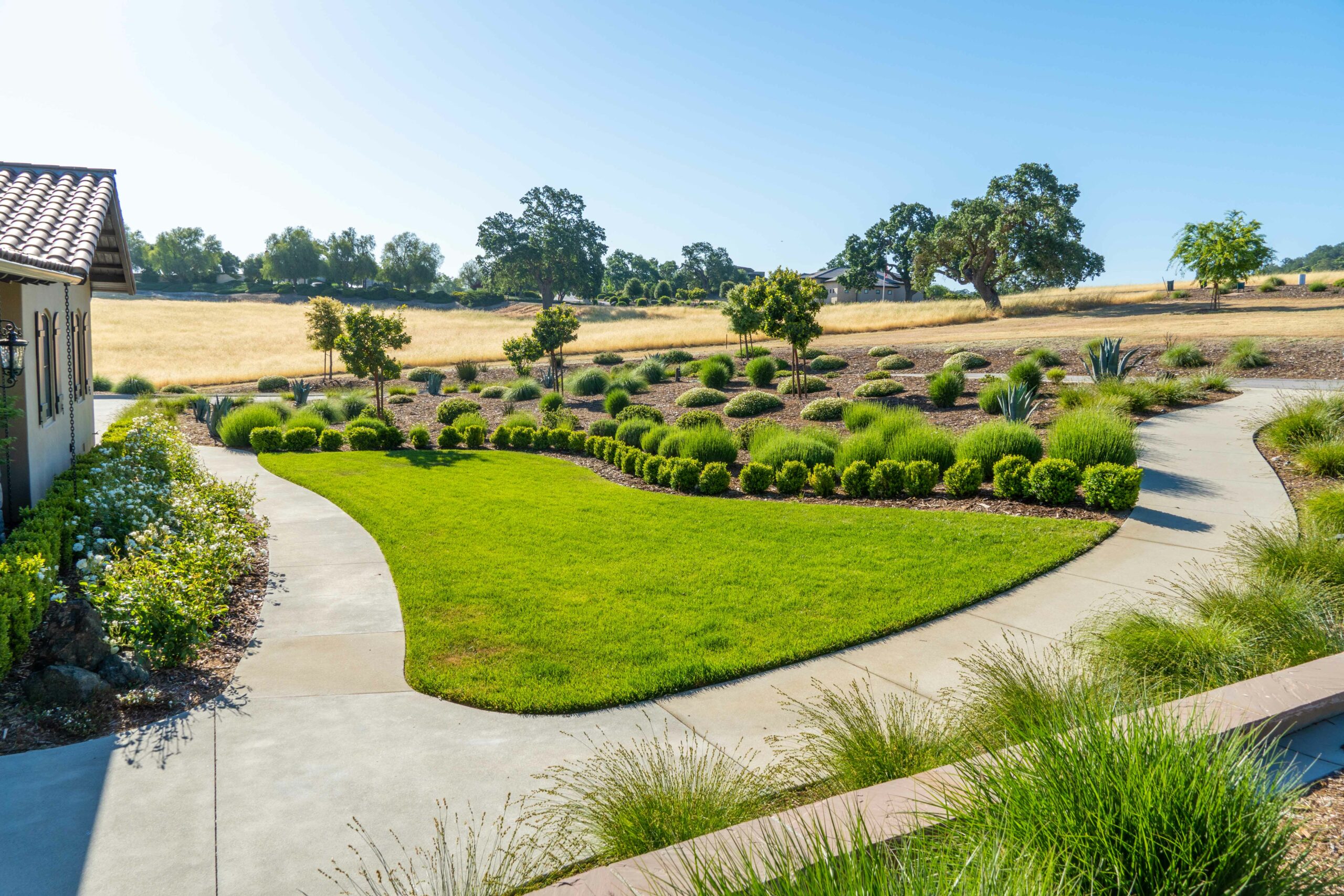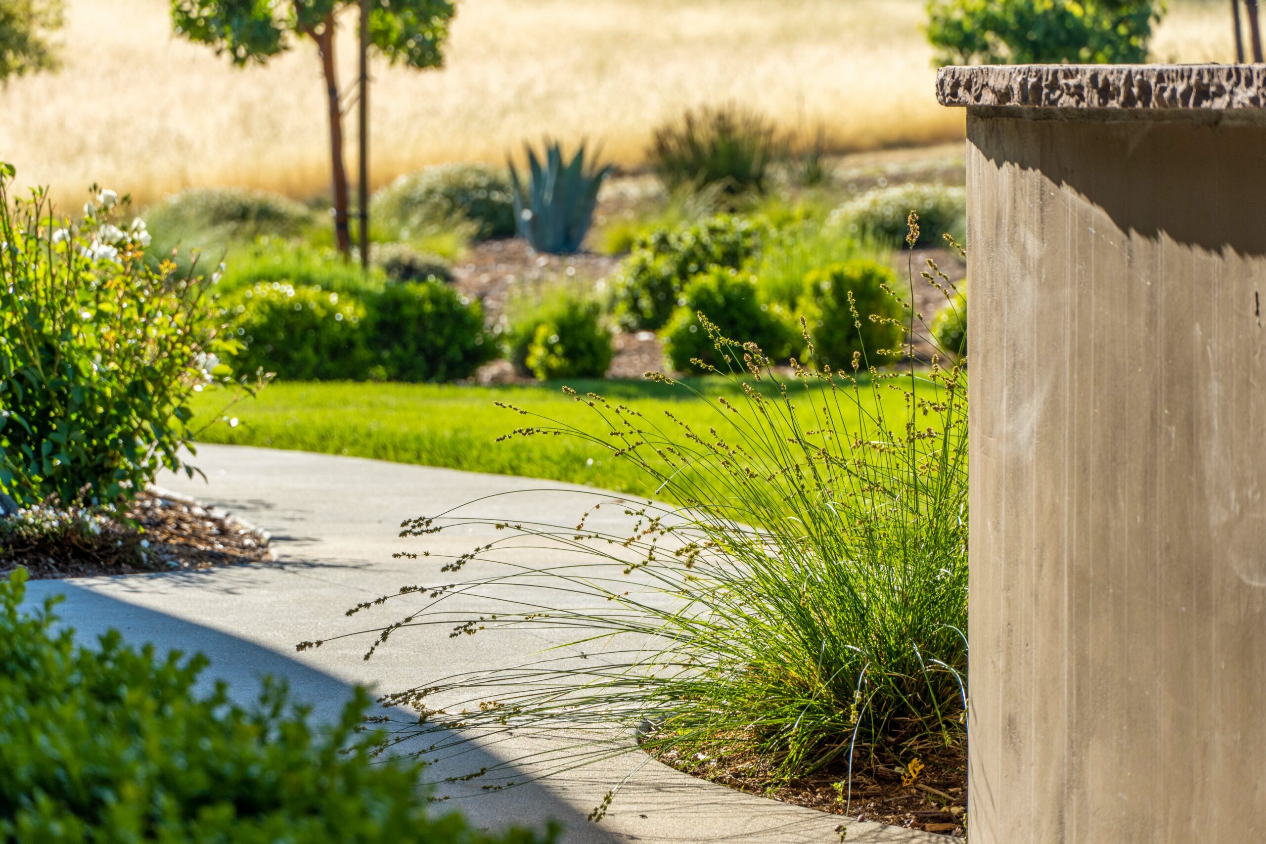 This extensive landscape design-build project within a prestigious gated community brings a natural softness to a classic architectural styling. Sweeping curves gracefully blend masses of ornamental grasses, lavender, and other flowering and natives shrubs, as well as pedestrian paths and a lush lawn alongside the entry walk. White roses and rows of boxwood lend a touch of traditional formality near the house, while arching grasses soften edges and large blue agave lend year-round accents.