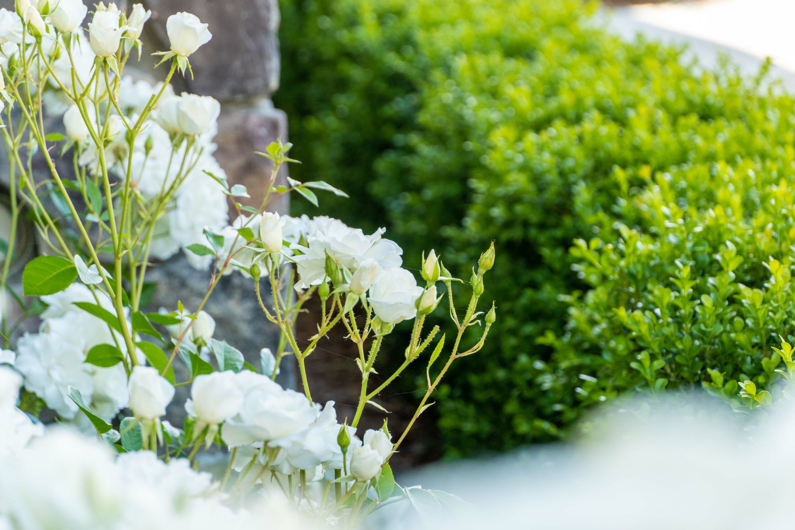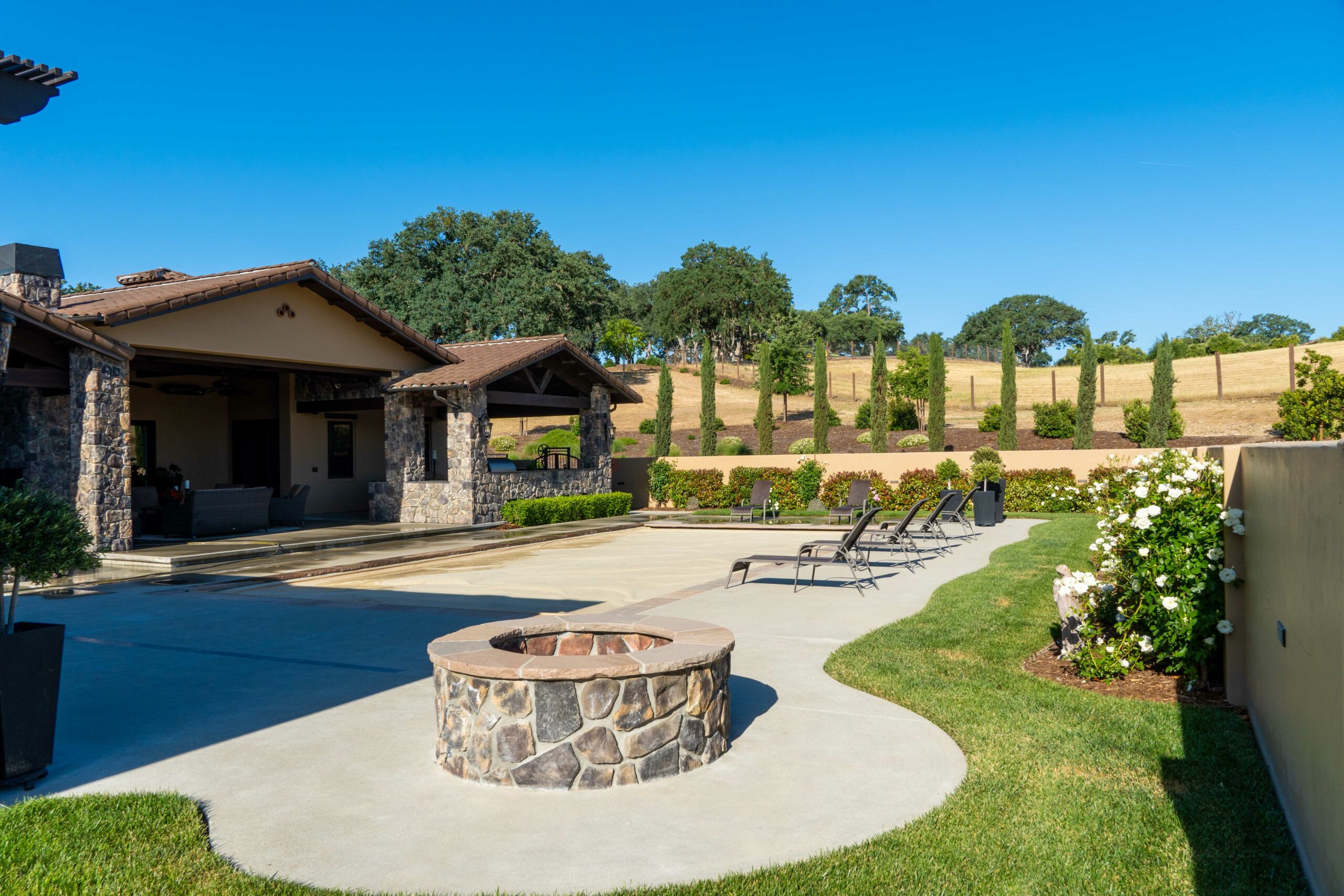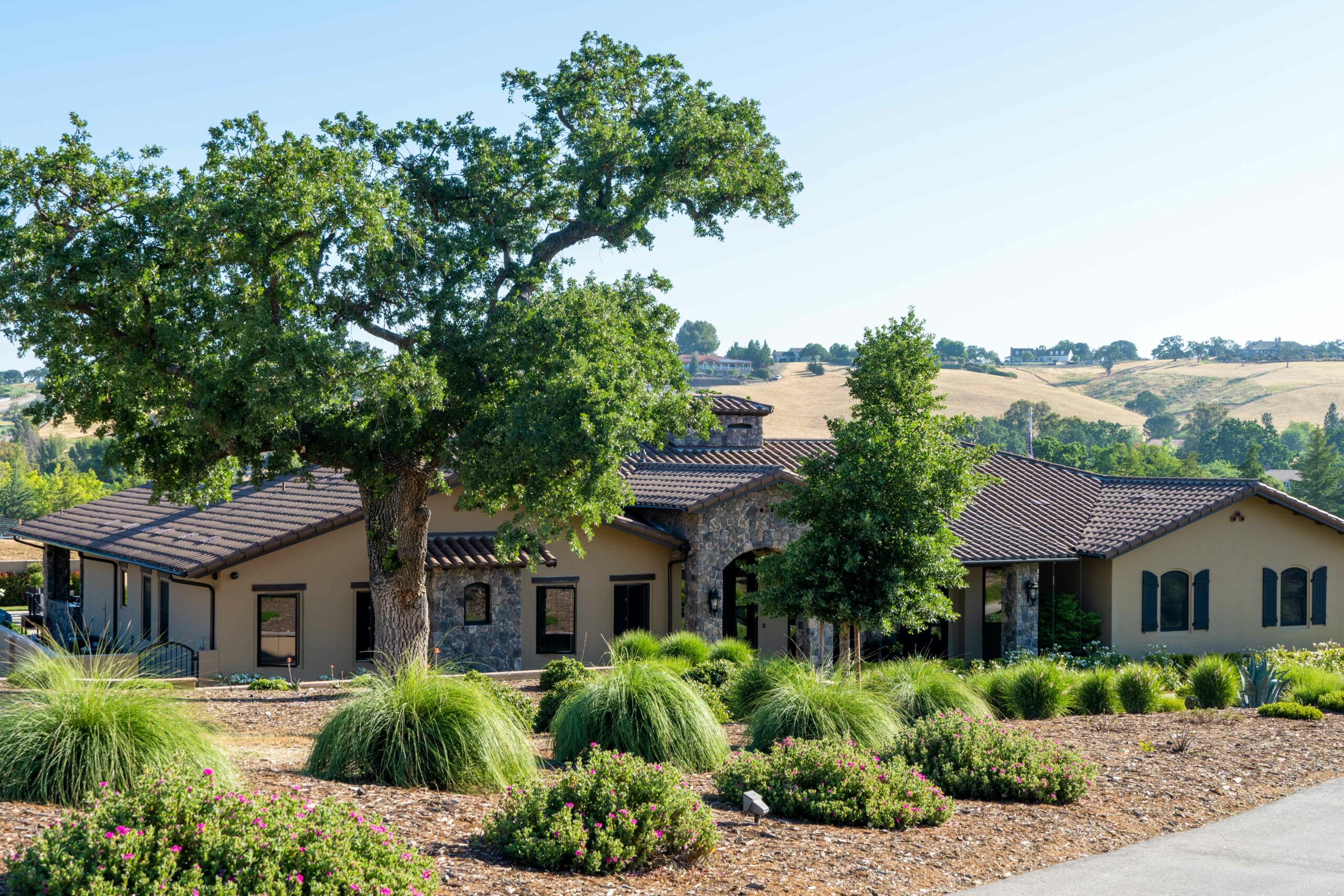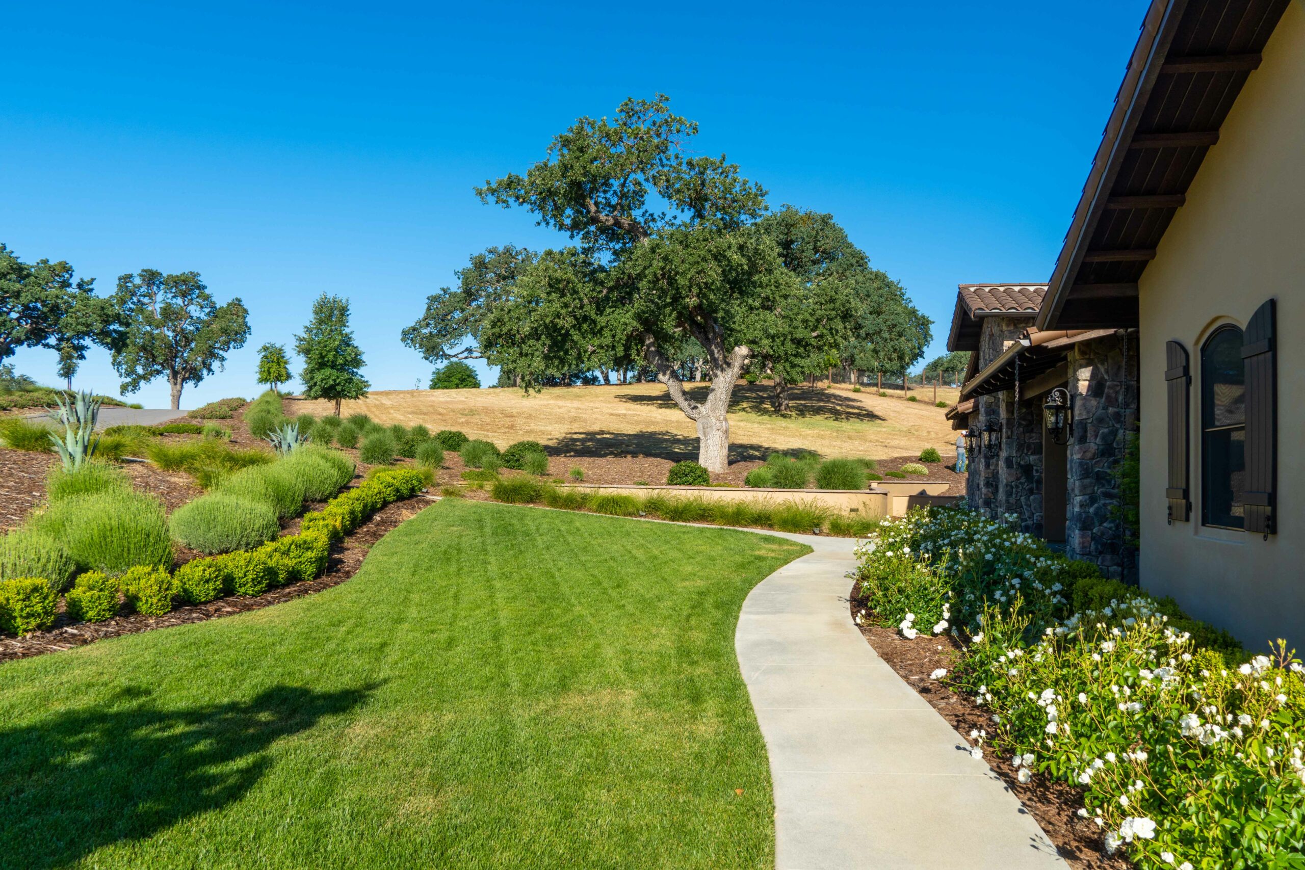 This extensive landscape design-build project within a prestigious gated community brings a natural softness to a classic architectural styling. Sweeping curves gracefully blend masses of ornamental grasses, lavender, and other flowering and natives shrubs, as well as pedestrian paths and a lush lawn alongside the entry walk. White roses and rows of boxwood lend a touch of traditional formality near the house, while arching grasses soften edges and large blue agave lend year-round accents.